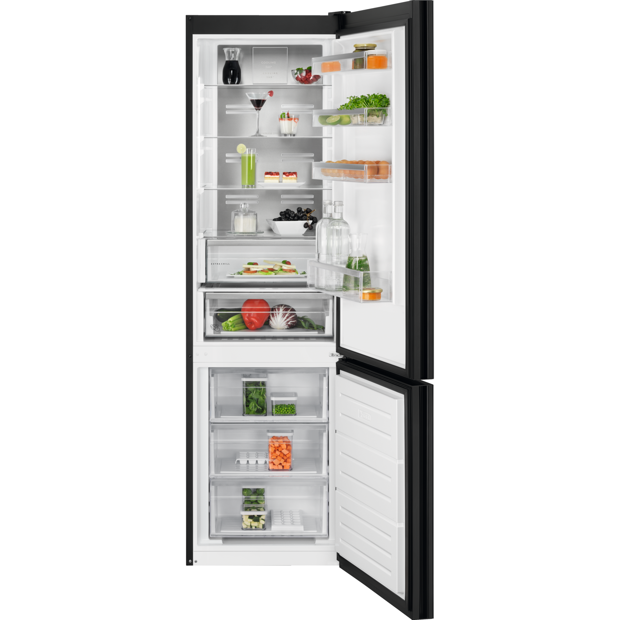 Protege la calidad de los alimentos y mantenlos frescos con los frigoríficos de AEG. Puedes organizar el almacenamiento de tu frigo como quieras. Sus modernas tecnologías hacen circular el aire frío por todo el dispositivo para mantener una temperatura estable, conservando mejor los alimentos y evitando que se sequen.