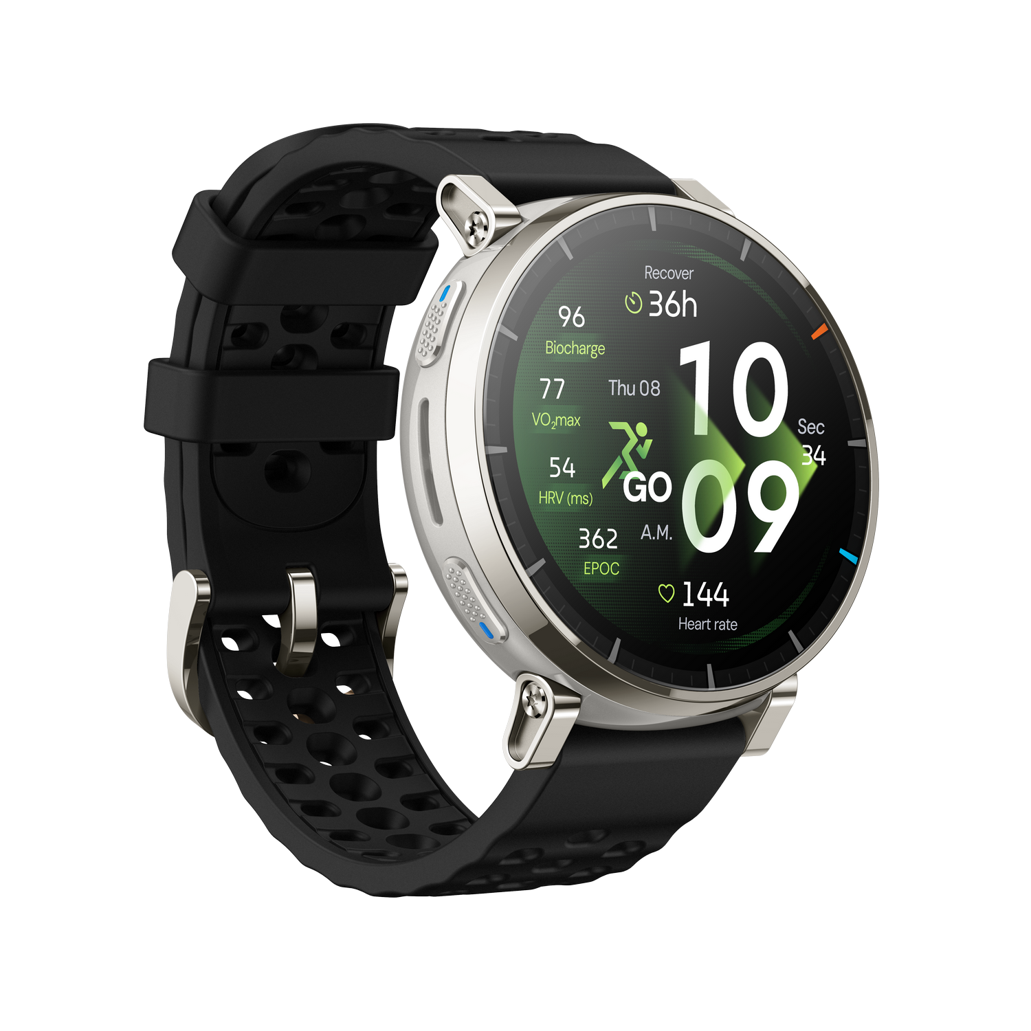 Distancia, Tiempo de recuperación, Velocidad max., Velocidad/Vuelta/Ritmo, Zonas de frecuencia cardíaca, Consumo de calorías, Pulso, Duración del sueño, Fases/-calidad del sueño, Pasos, Nivel de estrés, Hora/Fecha