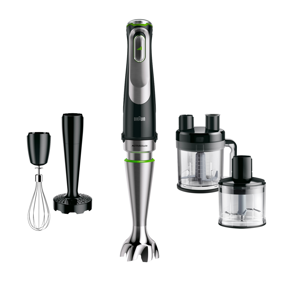 Batidora de mano - Braun Minipimer 7 MQ7025X, 1000 W, Vaso de 0.6 l, ActiveBlade, Easy Click Plus, SplashControl, 3 accesorios + Picadora, Negro/Acero