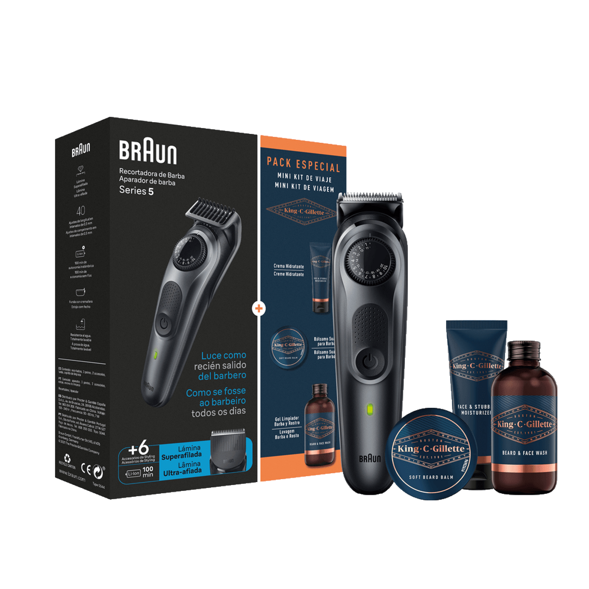 1x recortadora todo en 1 series 7, 1x Peine para barba de 3-11 mm, 1x Peine para pelo de 13-21 mm, 1x Cabezal de perfilado Pro, 1x Afeitadora de lámina ancha, 1x Recortadora para nariz y orejas, 1x Cabezal de recortadora corporal, 1x Peine para zonas sensibles (cuerpo), 2x Peines para degradado de barba, 2x Peines fijos de 1 y 2 mm, 1x Peine para cejas, 1x cargador SmartPlug, 1x base de carga, 1x cepillo de limpieza, 1x estuche.