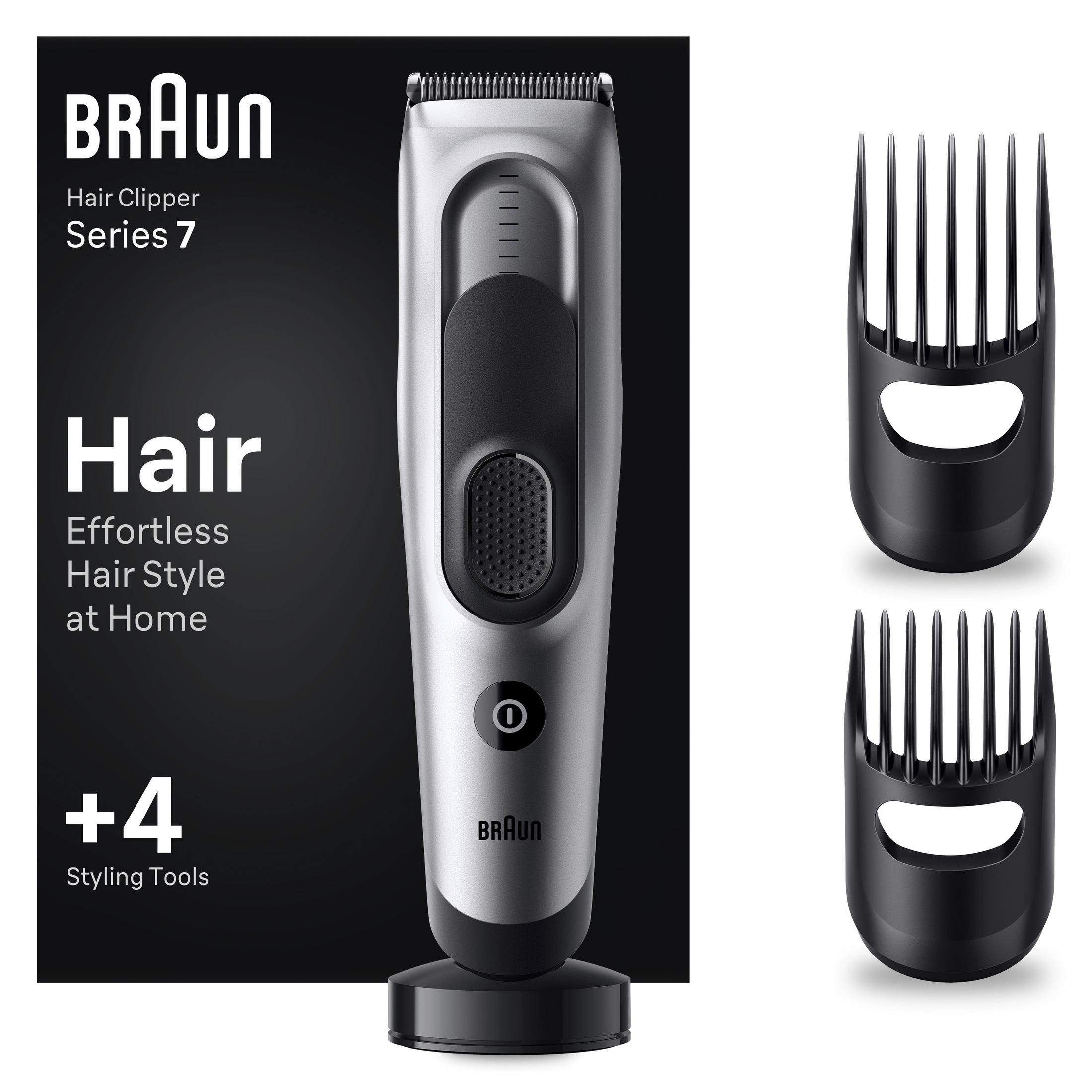 Cortapelos - Braun Series 7 HC7590, Memoria SafetyLock, 17 ajustes de longitud, 2 peines, Base de carga, 50 min autonomía , Gris