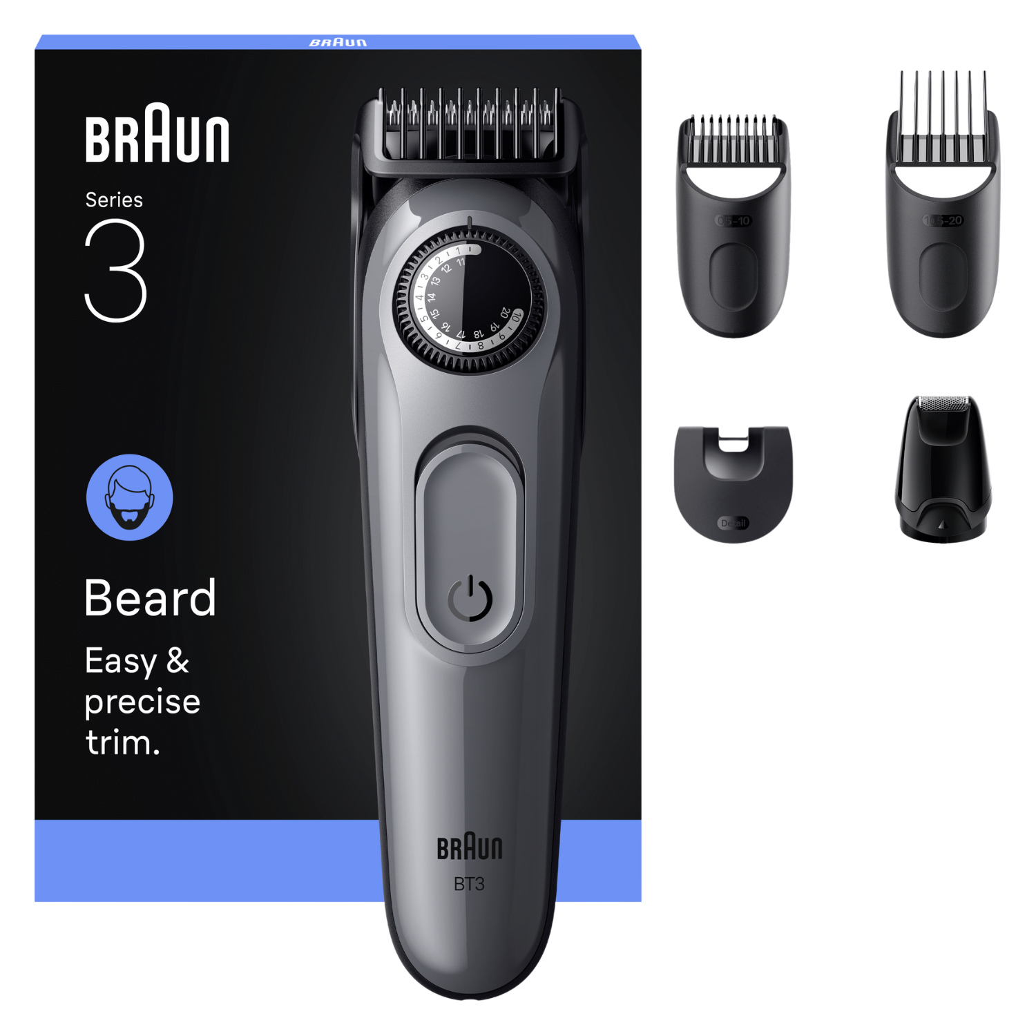1x recortadora de barba series 3, 1x Peine de precisión para barba de 0,5-10 mm, 1x Peine de precisión para pelo de 10,5-20 mm, 1x cepillo de limpieza, 1x cargador SmartPlug
