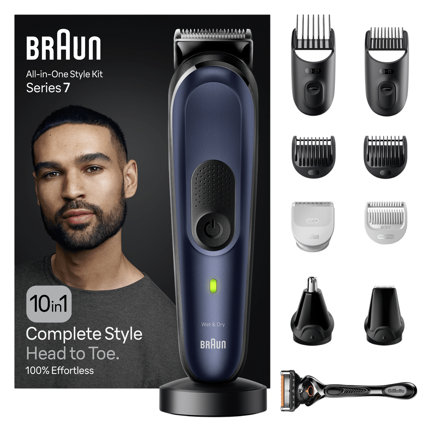 1 recortadora de barba series 7, 1x peine de precisión para barba de 0,5-10 mm, 1x peine de precisión para pelo de 10,5-20 mm, 2x peines para degradado de barba, 1x cabezal de perfilado Pro, 1x afeitadora de lámina ancha, 1x guía de perfilado de barba, 1 x estuche de viaje, 1x cepillito de limpieza, 1x base de carga, 1x cargador Smartplug.