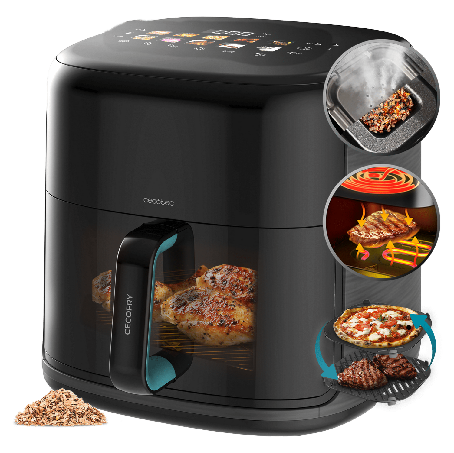 Freidora de aire - Cecotec Cecofry&Grill Smokin’ 8500, 2200W, 8.5L, 10 menús, Ahumador, 3en1, Pizza Maker, Doble resistencia, Incluye chips de madera