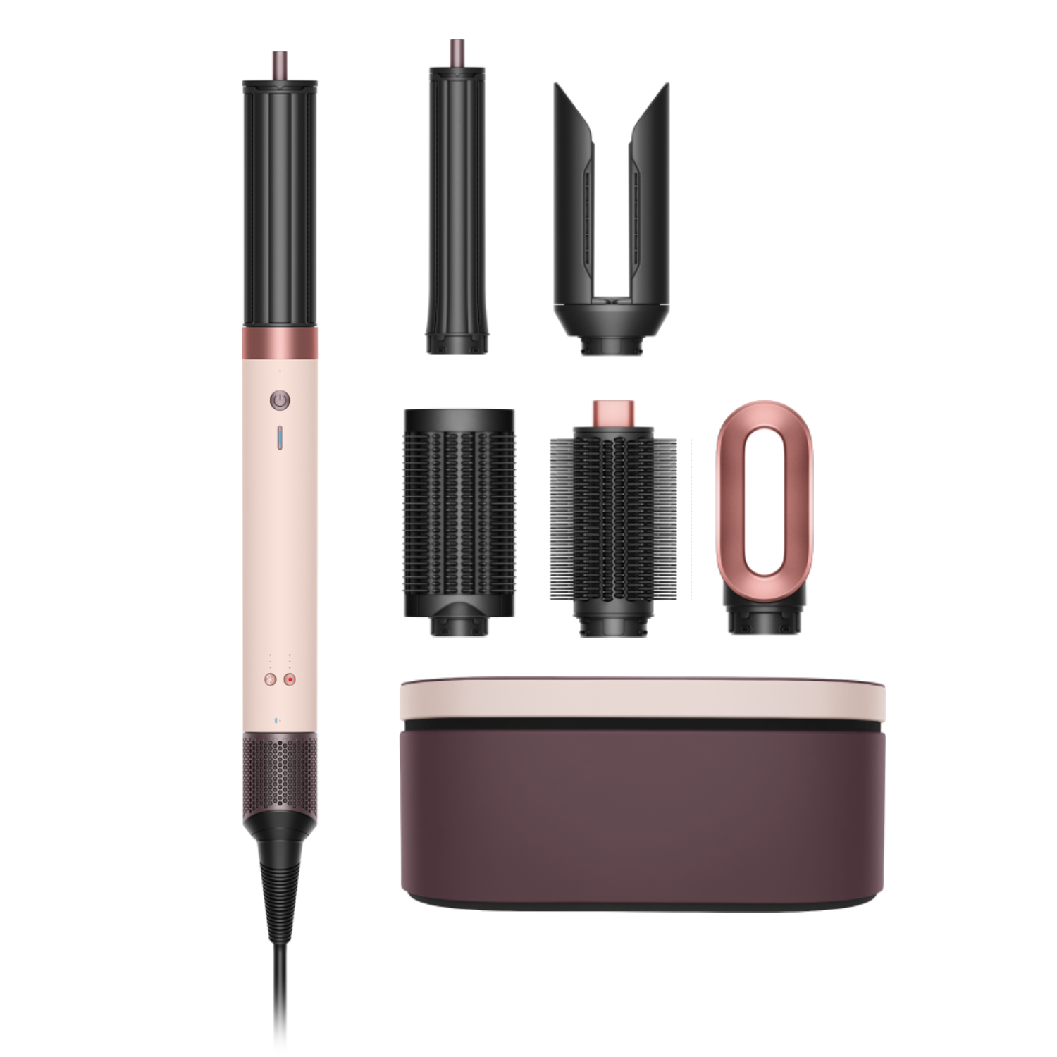 1x Dispositivo, 1x accesorio de secado y alisado de cabellos rebeldes, 1x accesorio cónico para rizos, 1x accesorio para rizos largo Airwrap de 40 mm, 1x cepillo suave para alisar, 1x cepillo voluminoso grande y redondo, 1x accesorio para secado rápido, 1x caja de presentación, 1x cepillo de limpieza de filtro