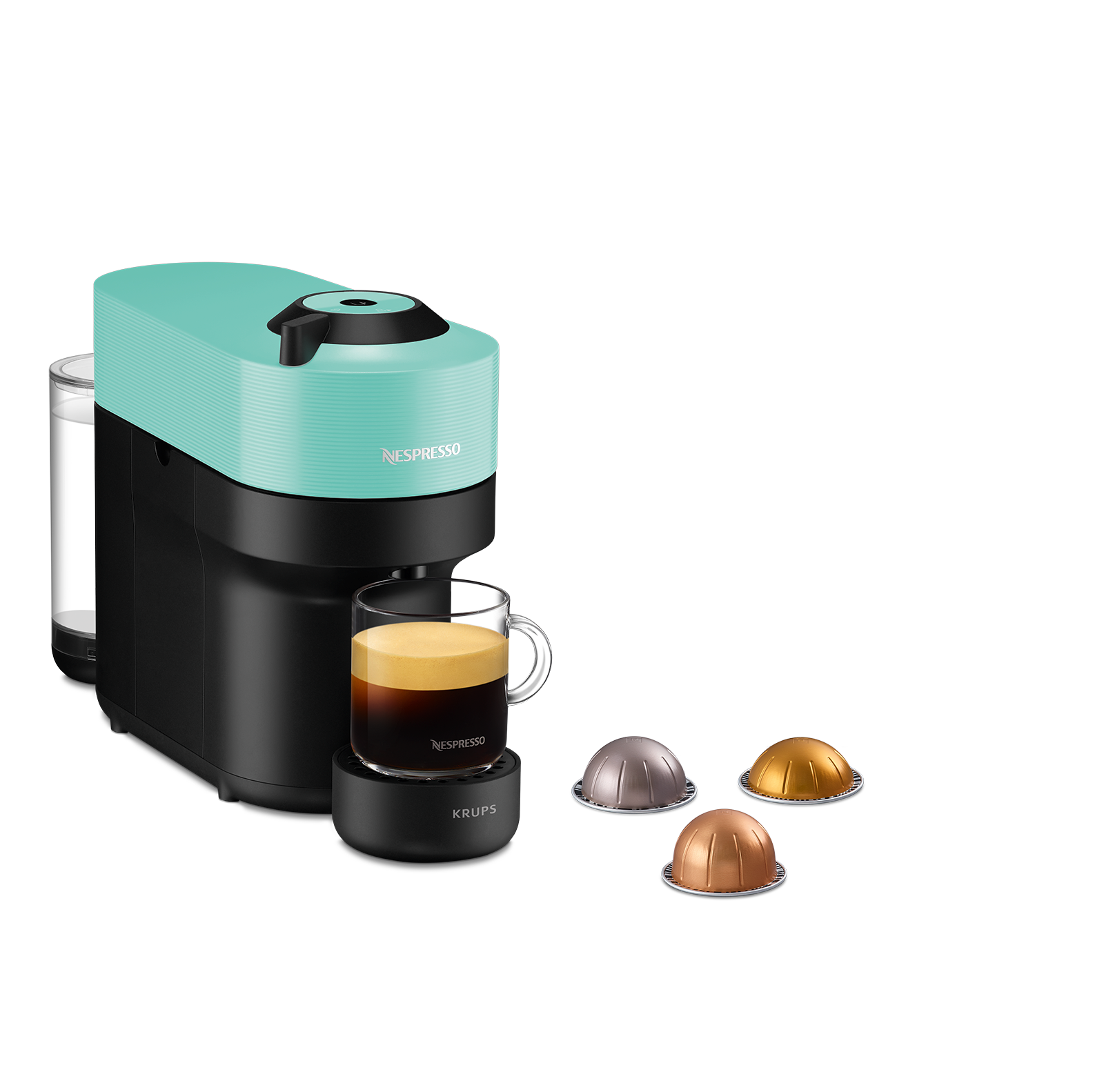 Cafetera de cápsulas - Nespresso® Krups Vertuo Pop XN920410, 1500 W, 0.56 L, Calentamiento 30 s, Tecnología Centrifusion™, Bluetooth, Wi-Fi, Aqua Mint