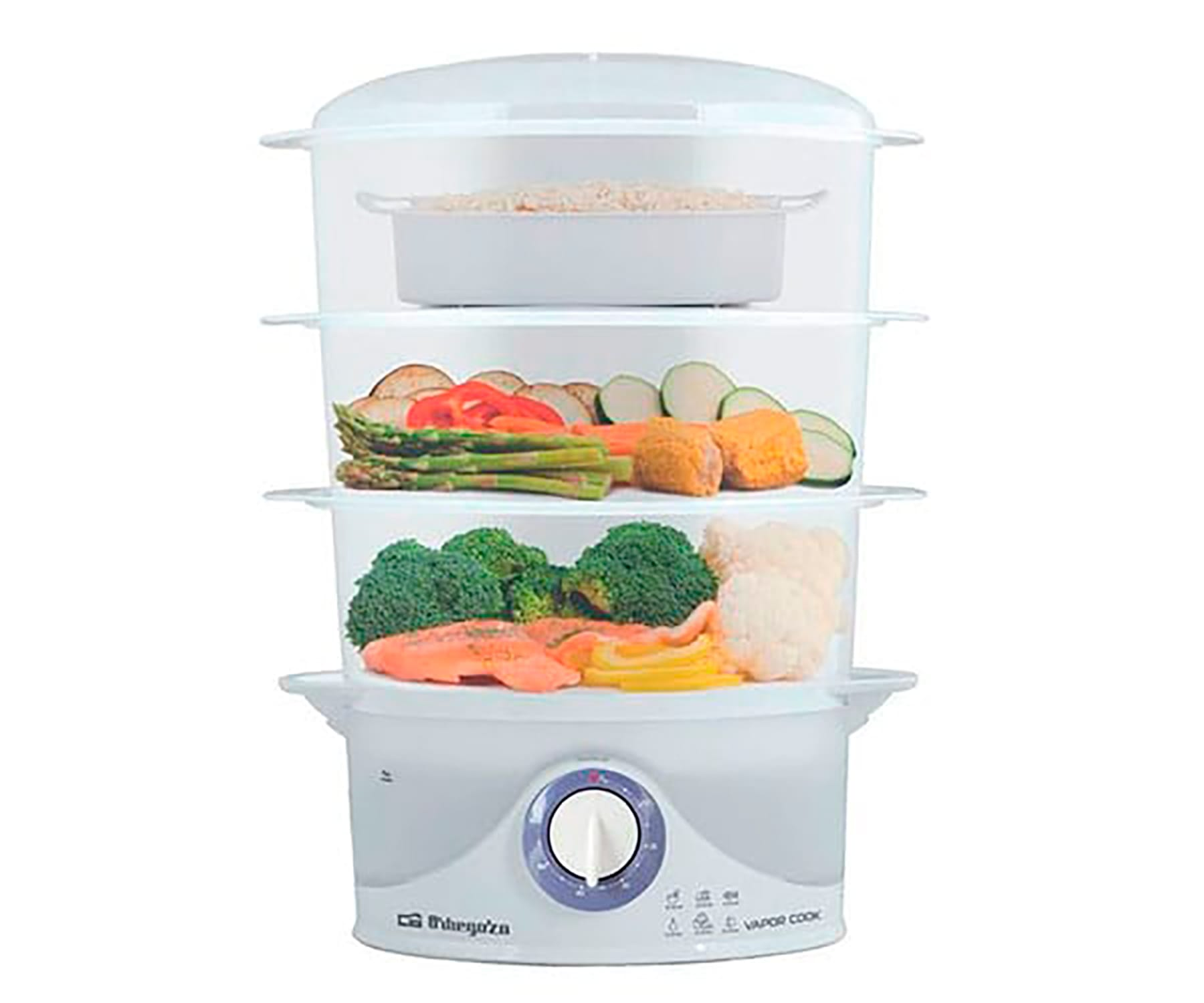 Cocedor al vapor Orbegozo CO 4015 en color blanco con 800W de potencia, tres recipientes apilables de 9 litros de capacidad, temporizador de 60 minutos, parada automática con señal acústica, indicador luminoso, visor del nivel del agua (1 litro de capacidad), recipiente con soportes para cocer huevos y recipiente especial para cocer arroz, ambos recipientes se pueden lavar en el lavavajillas ¿Qué destacamos? Cocedor al vapor 800W de potencia 3 recipientes apilables de 9L Temporizador de 60 minutos Parada automática con señal acústica Libre de BPA (Bisfenol A). Ideal para la cocción de carne, pescado, verdura, arroz, patatas y huevos. Conserva todas las propiedades y vitaminas de los alimentos. 230V-50Hz.