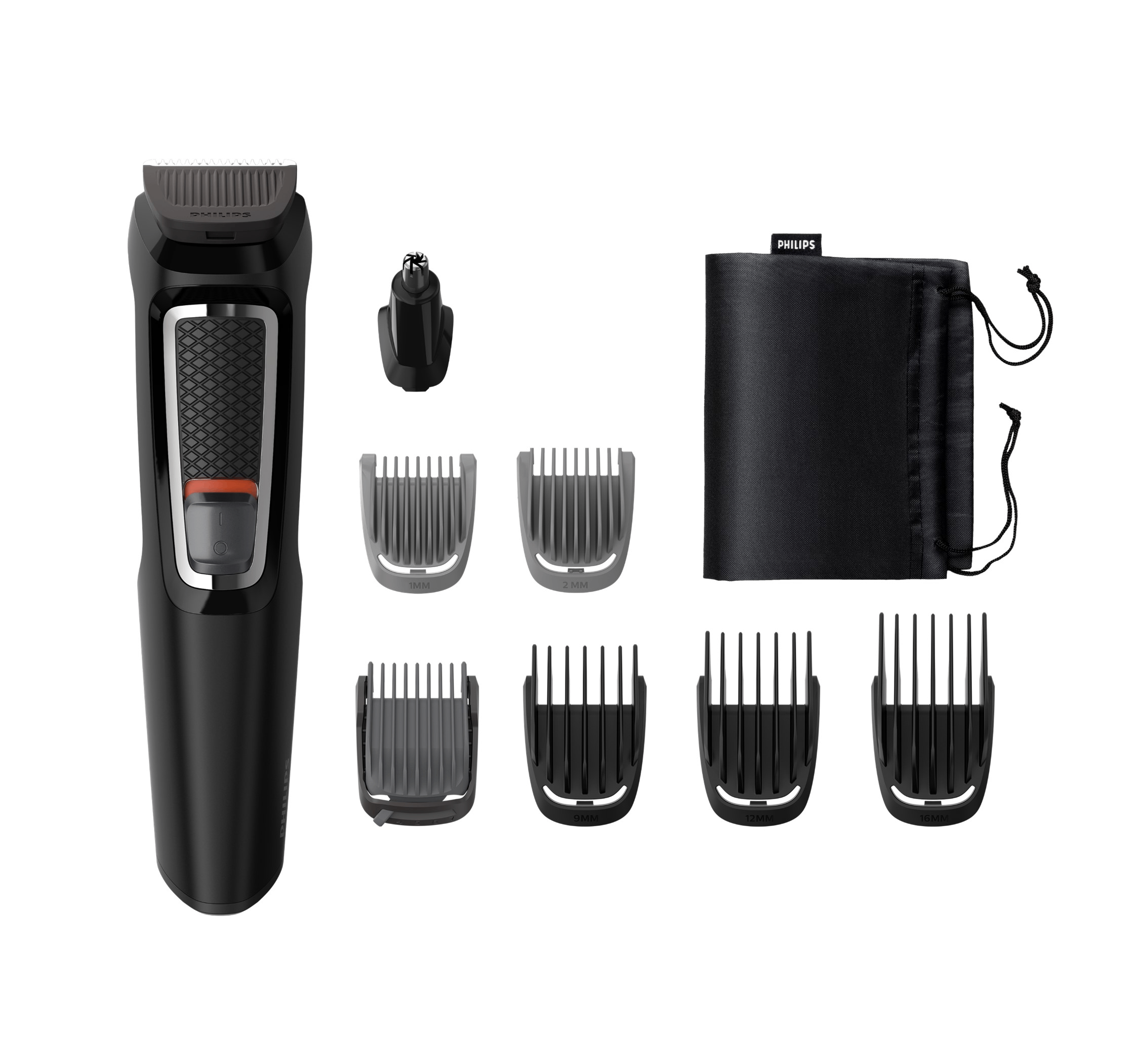 Recortador de acero, Recortador para nariz y orejas, Afeitadora corporal con protector para la piel, Recortador de precisión de acero, Recortador extraancho, Peine-guía de precisión, Peine-guía ajustable de 3-7 mm, Peine-guía ajustable de 9-13 mm, Peine-guía ajustable de 16-20 mm, 1 peineguía para el cuerpo, 4 peines-guía anchos