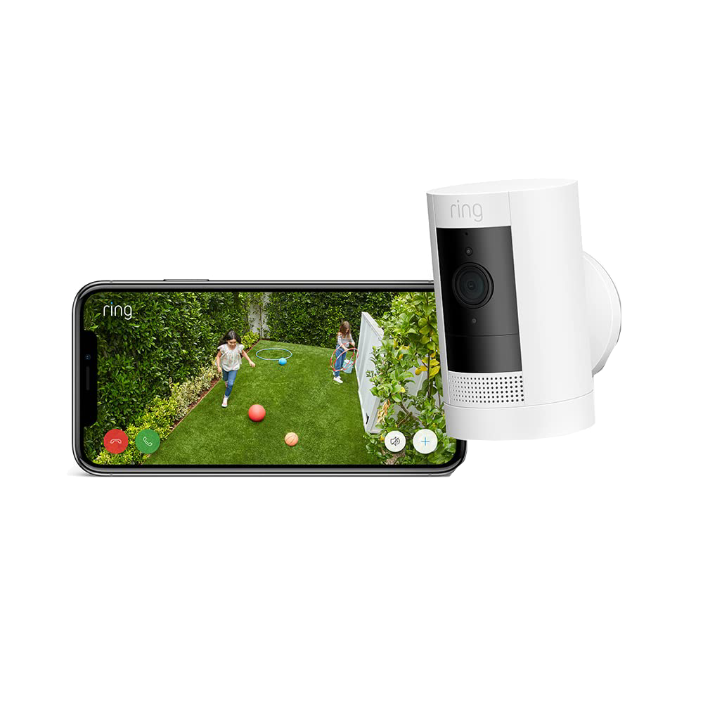 Cámara de vigilancia IP - Amazon Stick-Up Cam Battery, 1080p HD, Función de visión nocturna, Interior+Exterior, Inalámbrica, Blanco