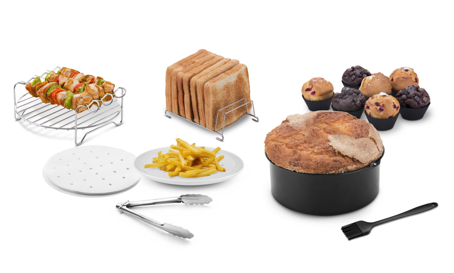 1x Molde para bizcochos, 1x Parrilla grill + 3x pinchos, 1x Bandeja para tostadas, 50x Unidades de papel vegetal, 7x Moldes Cupcake, 1x Pincel de silicona, 1x Pinzas
