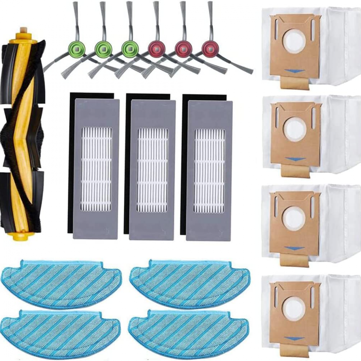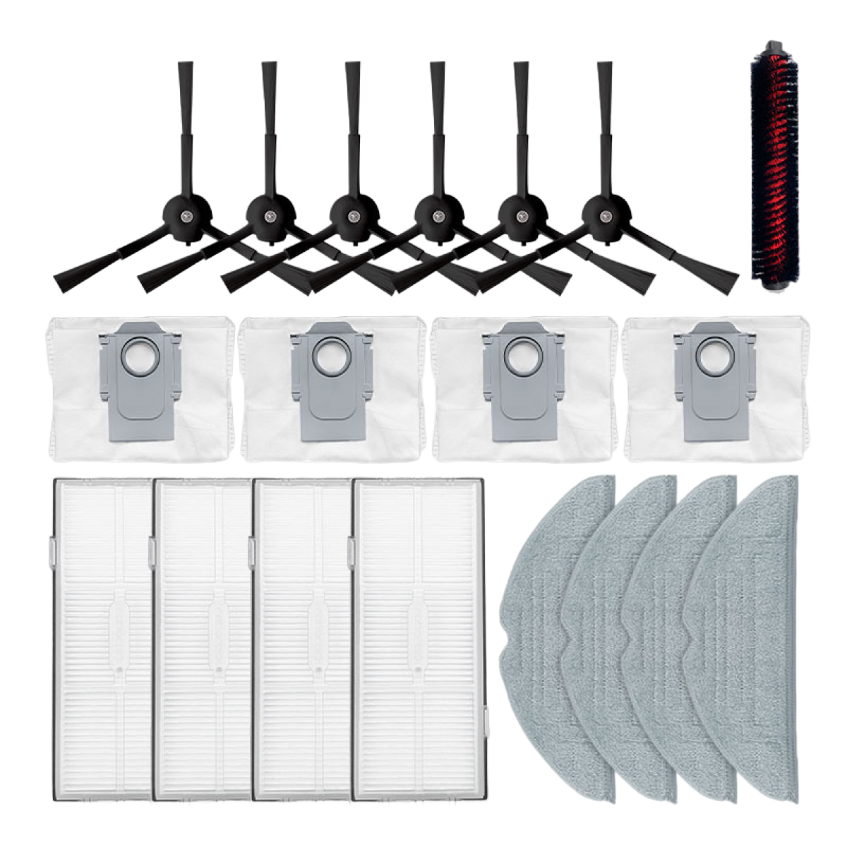 1 x par de cepillos para la cabeza (2 cepillos de goma) 4 filtros HEPA 4 x bolsas de aspiradora 4 cepillos laterales 1 destornillador 1 cepillo de limpieza