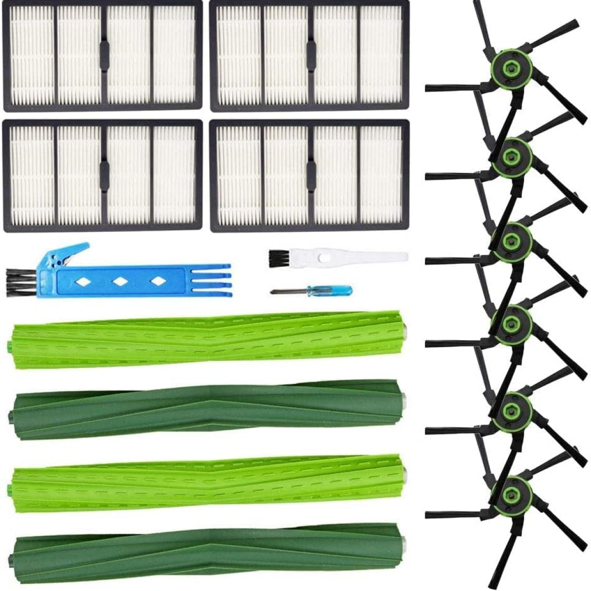 4 x cepillos de goma multisuperficie 4 filtros HEPA 6 cepillos laterales 1 cepillo de limpieza 1 destornillador