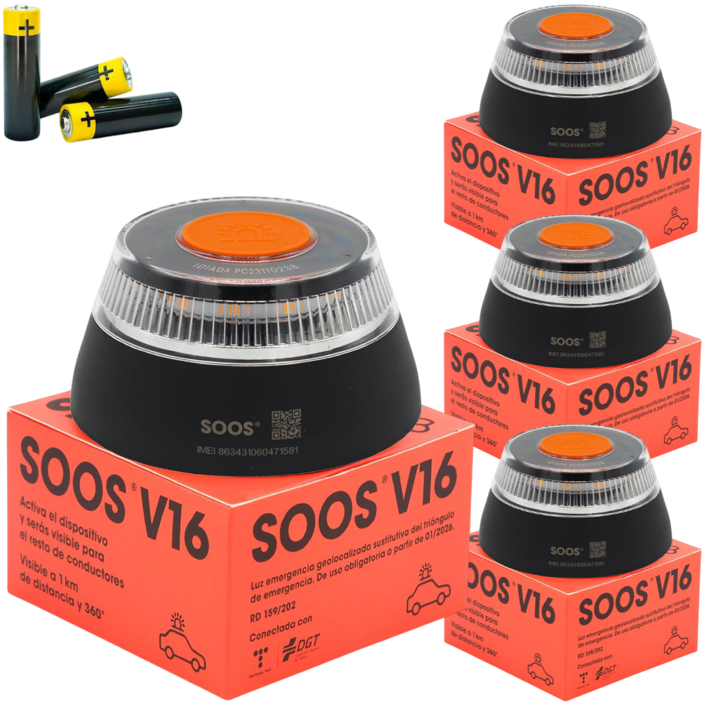 4x Baliza SOOS V16, 4x instrucciones, 12x pilas AA