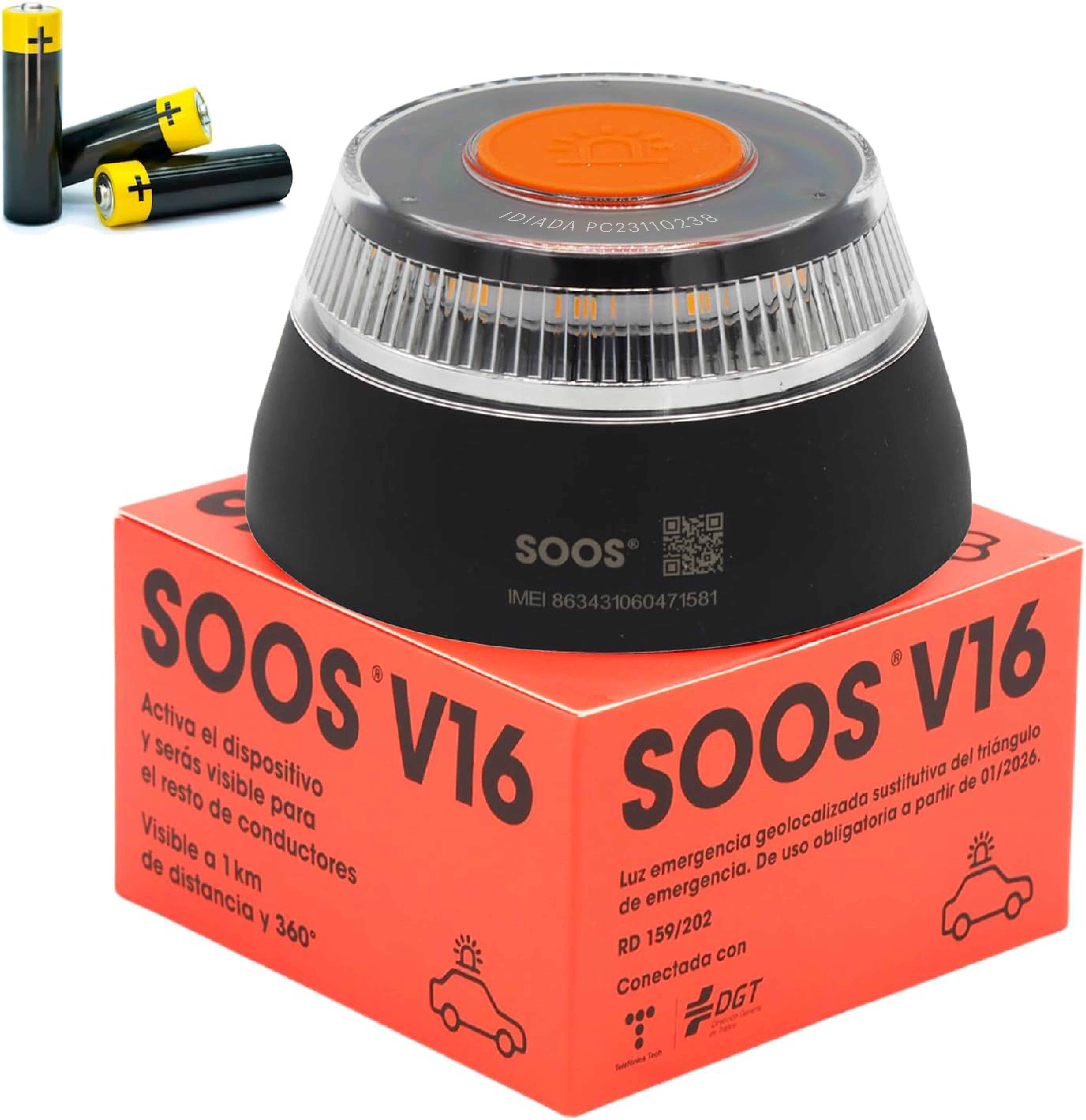 1x Baliza SOOS V16, 1x instrucciones, 3x pilas AA