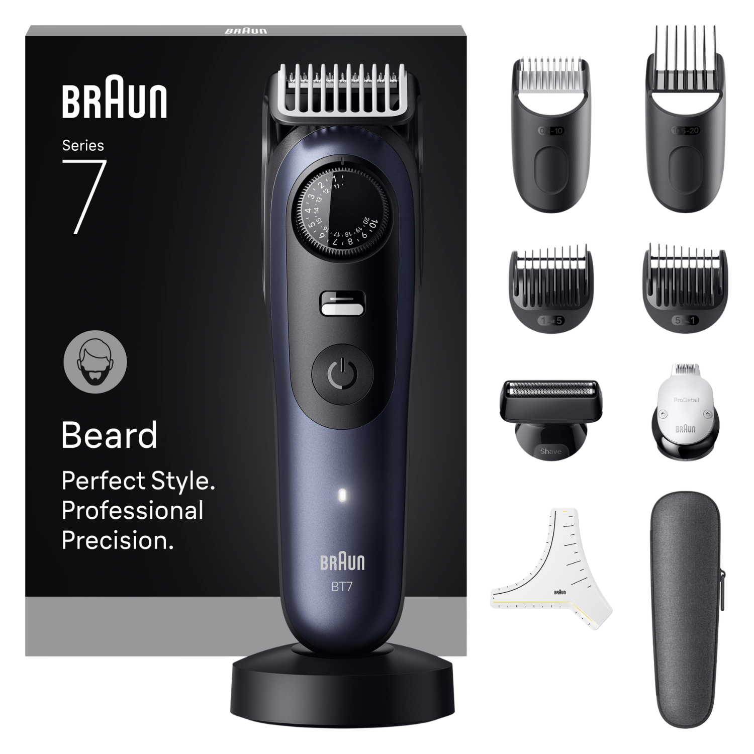 1 recortadora de barba series 7, 1x peine de precisión para barba de 0,5-10 mm, 1x peine de precisión para pelo de 10,5-20 mm, 2x peines para degradado de barba, 1x cabezal de perfilado Pro, 1x afeitadora de lámina ancha, 1x guía de perfilado de barba, 1 x estuche de viaje, 1x cepillito de limpieza, 1x base de carga, 1x cargador Smartplug.