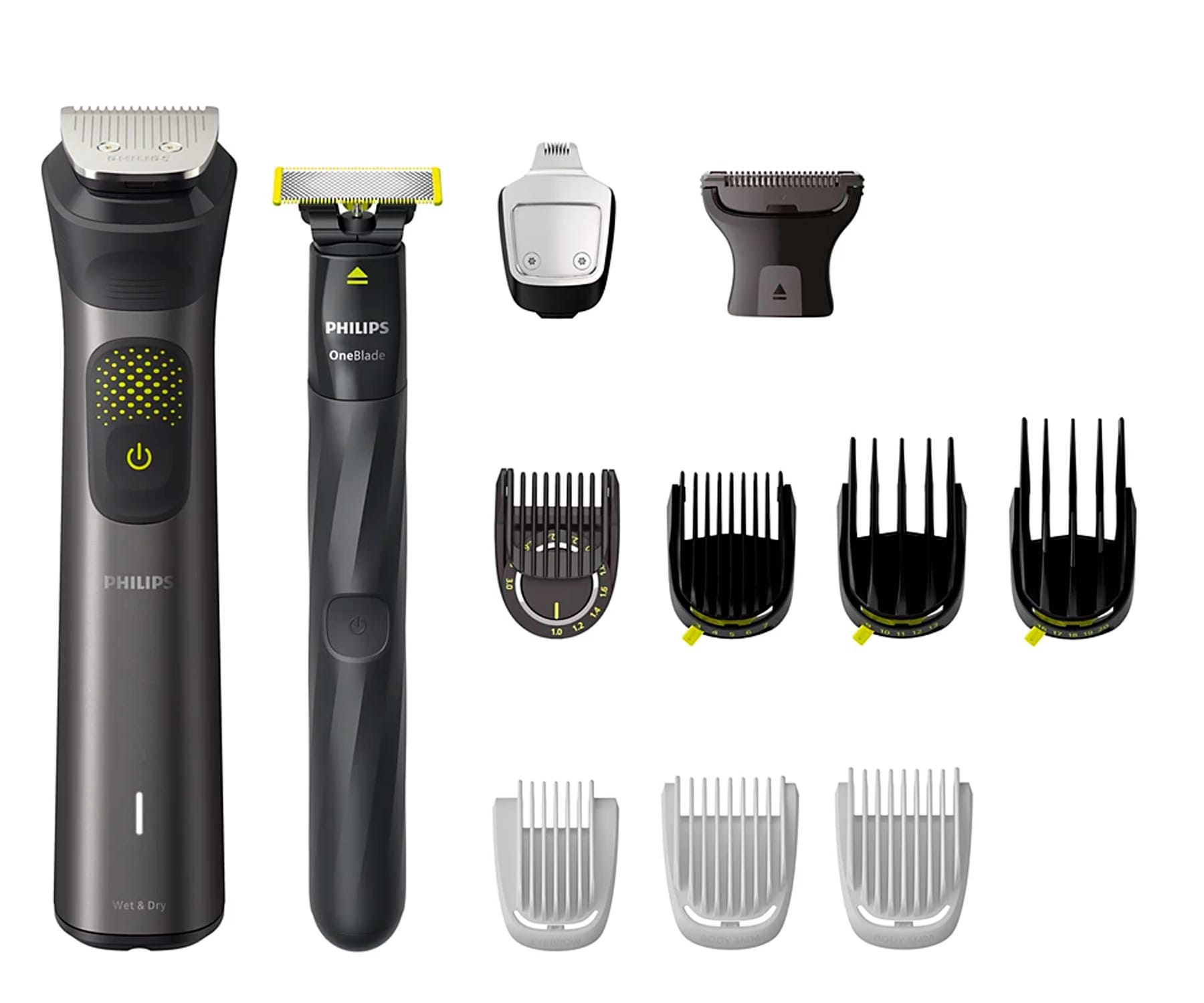 1x Afeitadora corporal, 3x Accesorios de tamaño completo, 7x peines