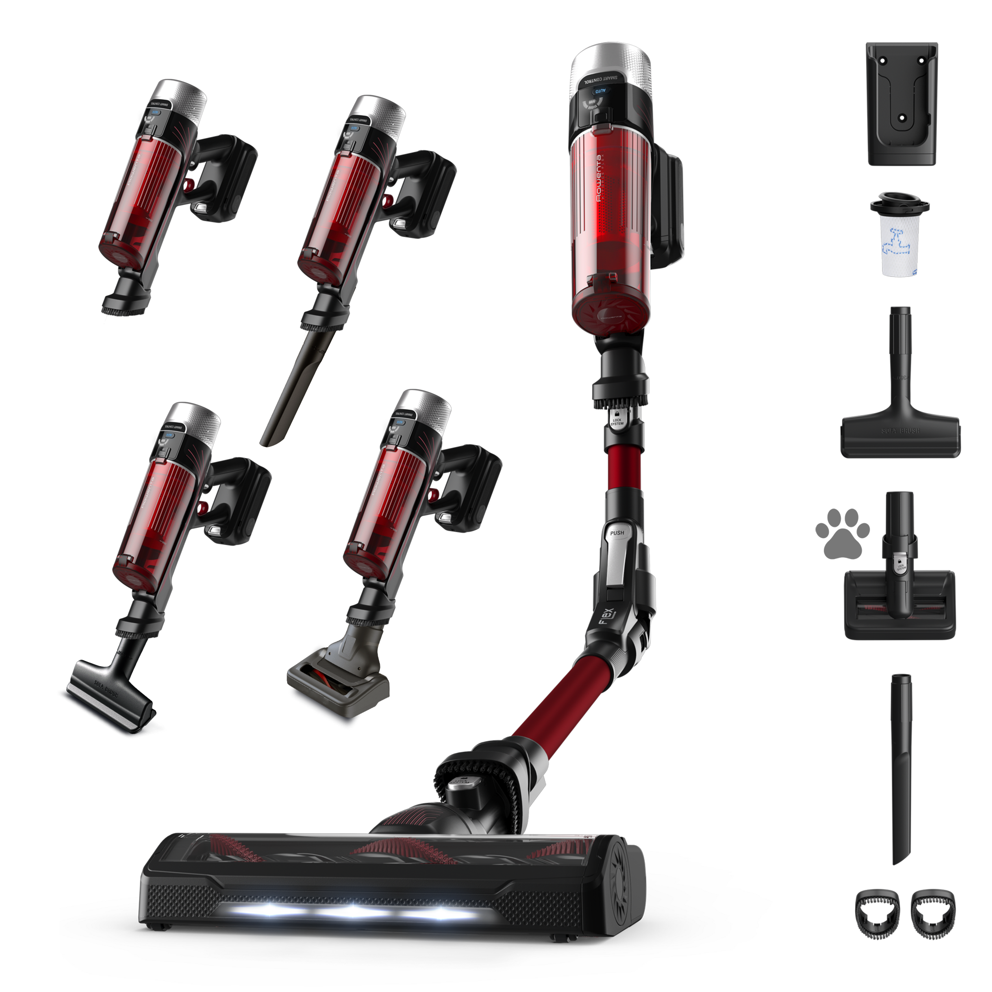 Aspirador escoba - Rowenta RH2079 X-Force Flex 9.60 Animal Care, 200 W, 0.4 L, 45 min, Tecno.Ciclónica, 3 modos, Ultraligera, Especial Mascotas, Roja