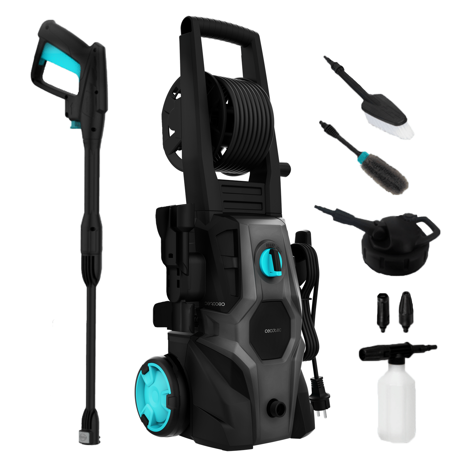 3DTurboFlip,Boquilla,Boquilla normal,Botella regulable para el jabón,Cargador,Cepillo especial para llantas (Cepillo gris ovalado),Cepillo para esquinas (cepillo blanco),Filtro anti impurezas,Hidrolimpiadora,Lanza plástica,Manguera de alta presión 8 metros,Manual de instrucciones,Patio cleaner(Accesorio para suelo) (cepillo circular nº1),Pistola de alta presión
