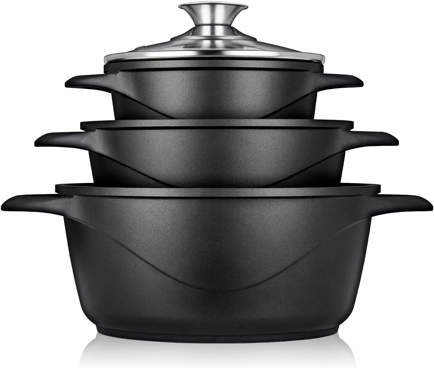 Batería de Cocina Inducción 6 Piezas Aluminio Fundido 3 Ollas con Tapa de Cristal Antiadherente