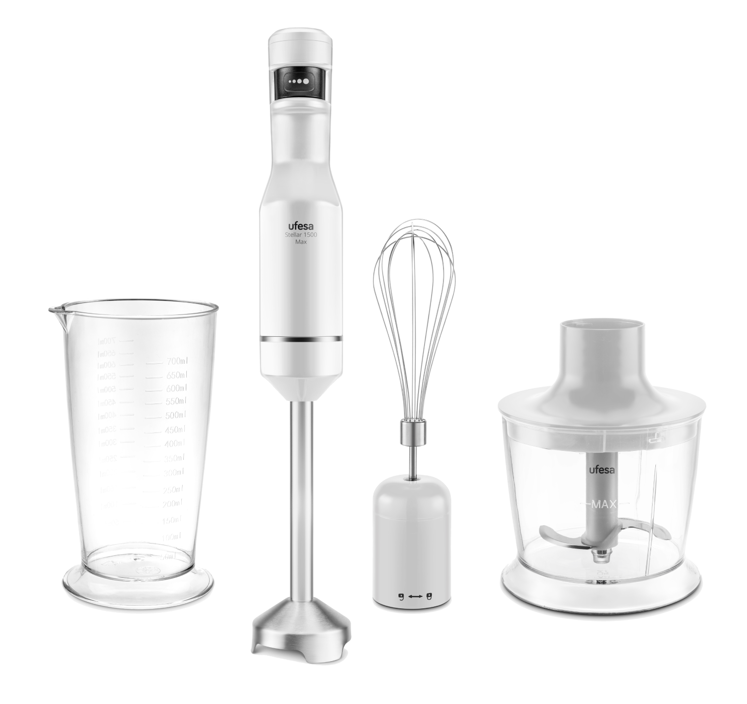 Batidora de mano - Ufesa Stellar 1500 Max, 1500W, Velocidad variable, 4 cuchillas, Pantalla Digital, Blanco/Inox