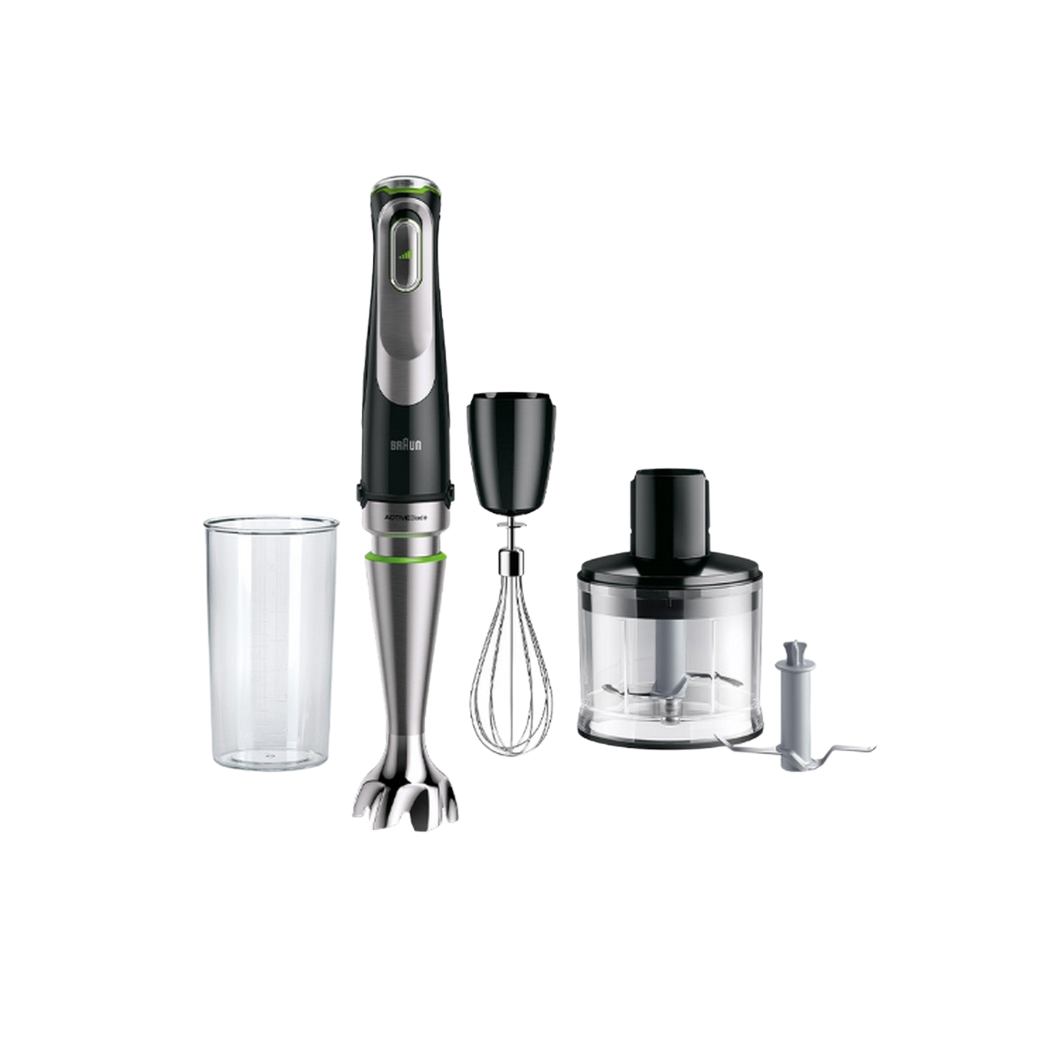 Batidora de mano - Braun Minipimer 7 MQ7025X, 1000 W, Vaso de 0.6 l, ActiveBlade, Easy Click Plus, SplashControl, 3 accesorios + Picadora, Negro/Acero