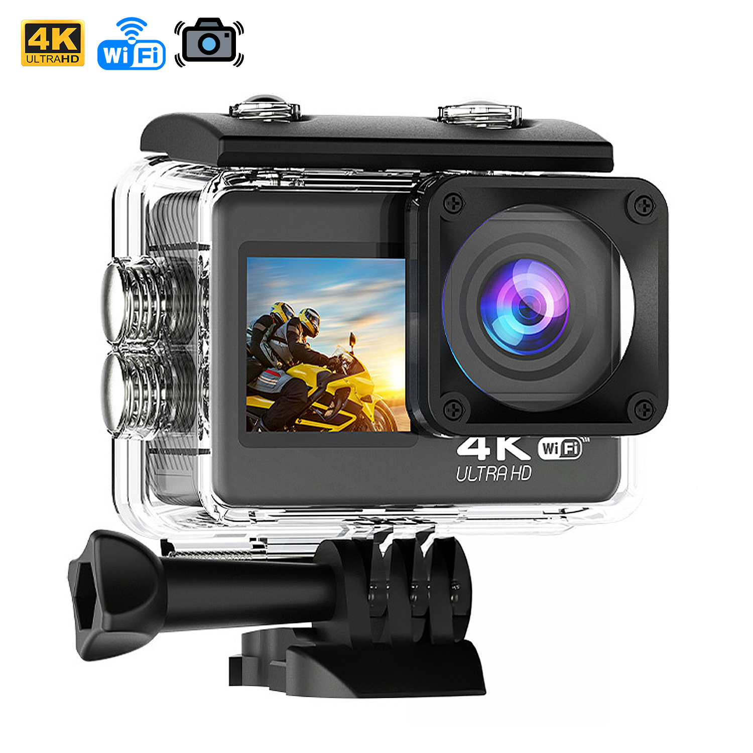 1x carcasa estanca, 1x soporte para carcasa estanca, 1x soporte de clip para carcasa estanca, 1x soporte para manillar bici/moto, 1x control remoto de cámara, 1x soporte para casco, 2x correas ajustables, 1x cable USB Tipo C, 1x manual de instrucciones y 1x funda de transporte