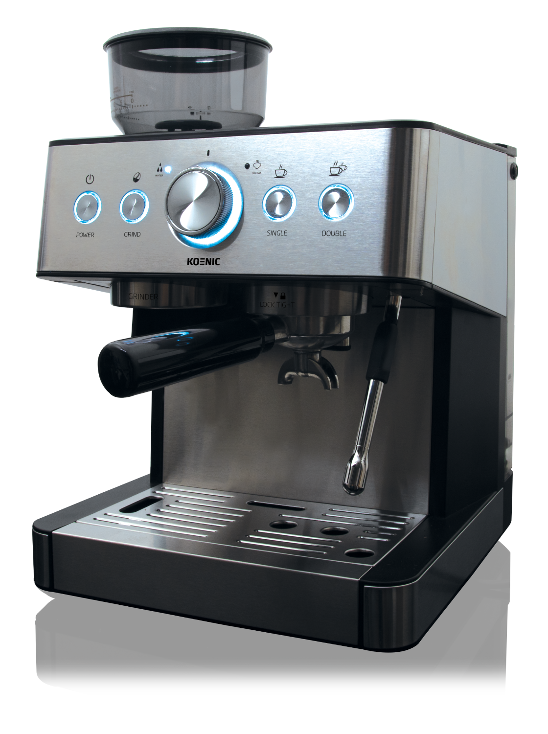 Cafetera express - KOENIC KEM 21524 M, 15 bar, 1650 W, 2 Tazas, Espumador, Botón Grind, Plata