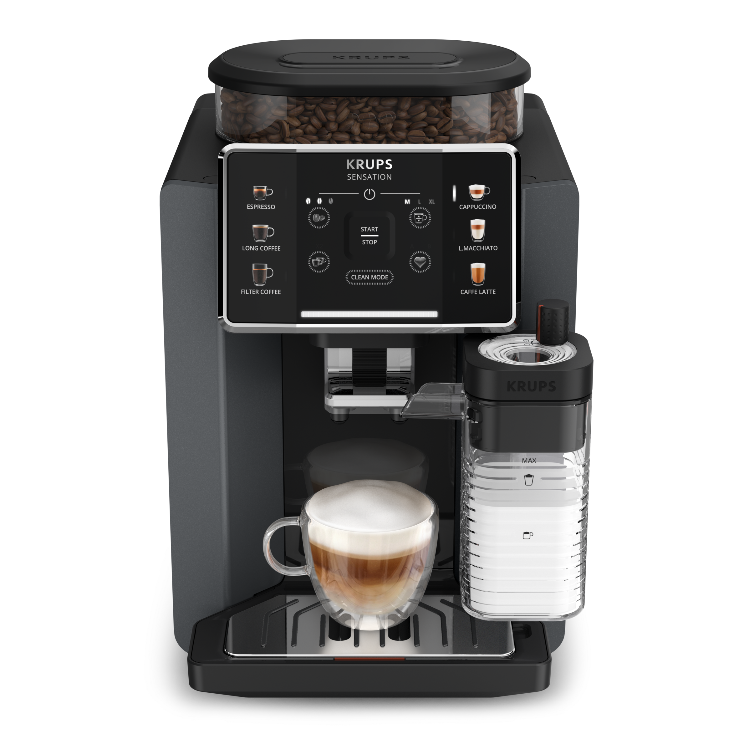 Cafetera superautomática - Krups Sensation Milk EA912B, 15 bar, 1450 W, 1.7 L, 6 modos, 2 tazas, Depósito de leche 0.3 L, Táctil, Gris