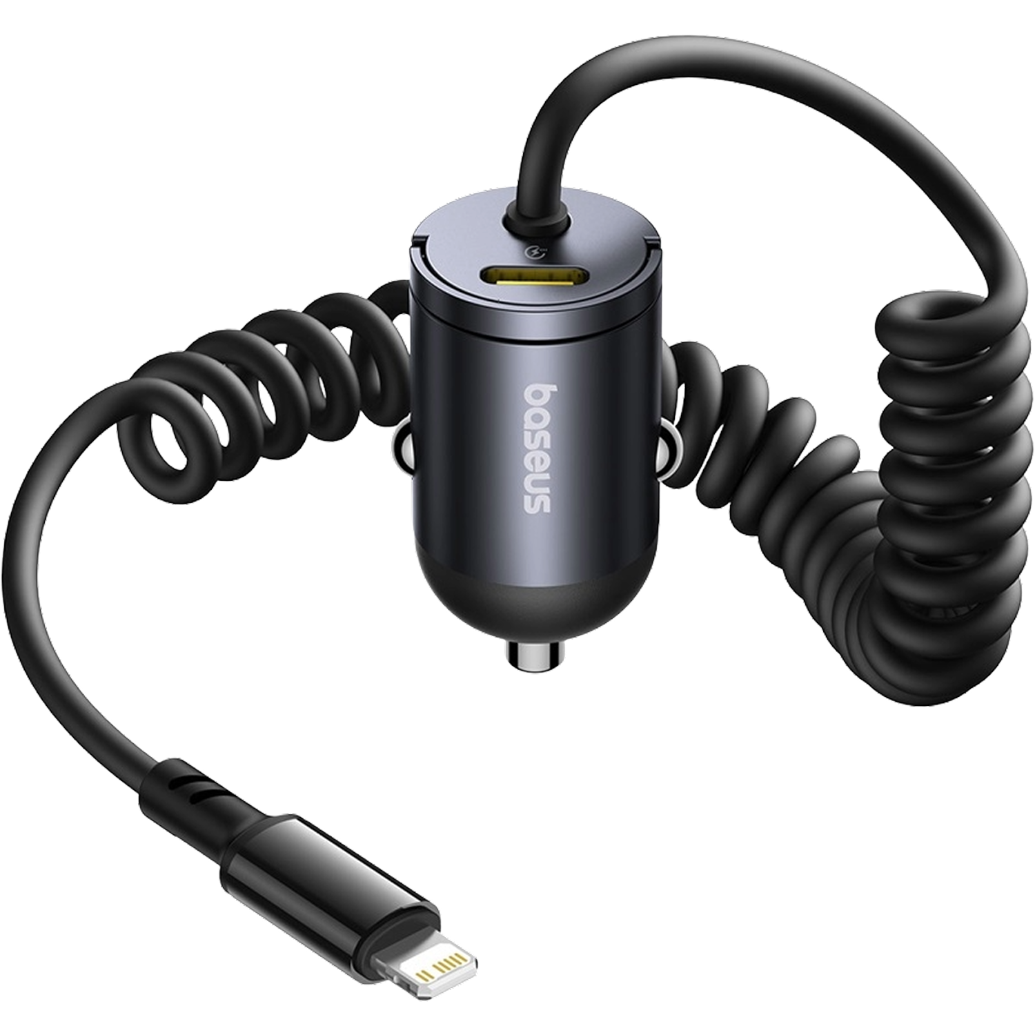 Cargador coche - Baseus Tiny Star Mini, 30W, Tipo-C y Lightning, Carga rápida, Con cable rizado incorporado, Multidispositivo, Universal, Negro Cosmic