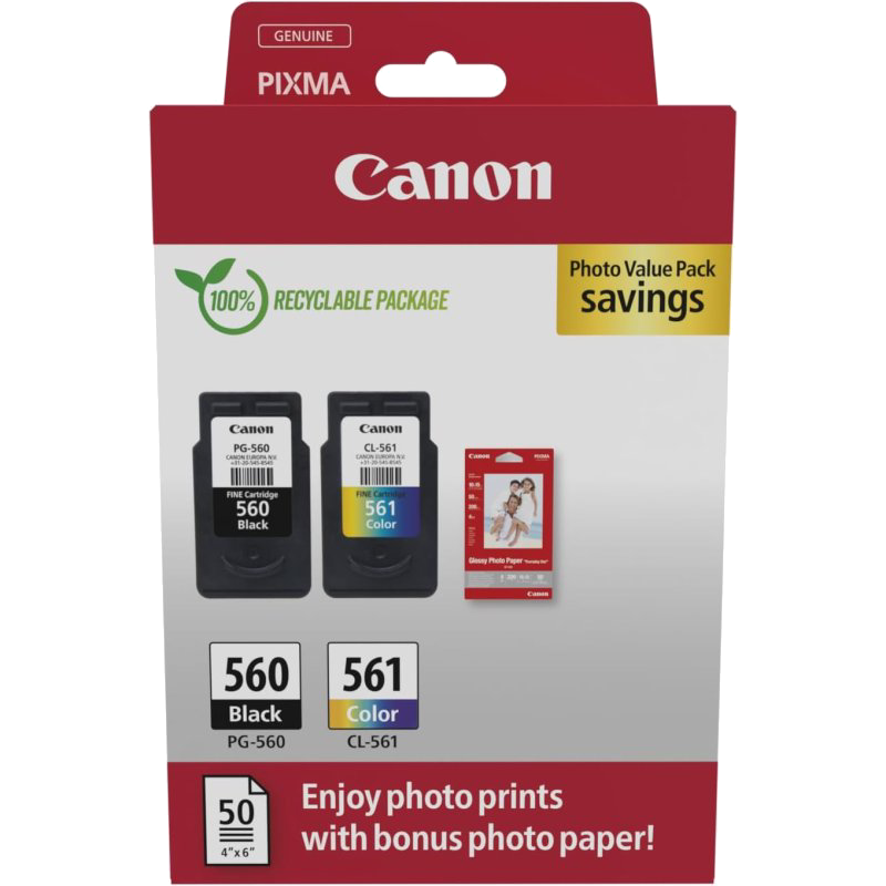 Cartucho de tinta - Canon PG-560/CL-561, 7.5 ml y 8.3 ml, 180 páginas, Negro y Color (cian, magenta, amarillo)