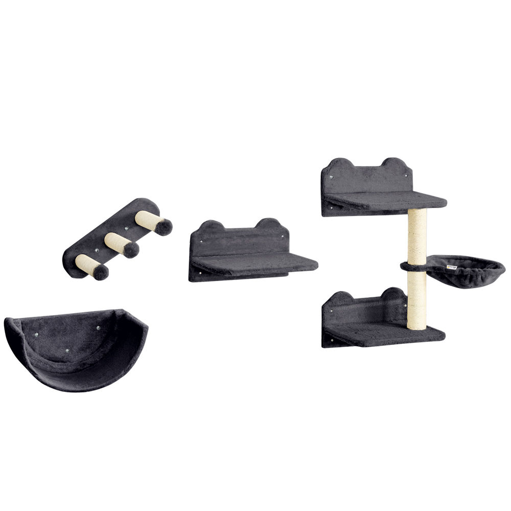 1x Árbol para gatos, 2x Plataformas grandes, 2x Plataformas pequeñas, 1x Cueva, 1x Percha acolchada, 1x Base, 1x Conjunto de postes rascadores de sisal