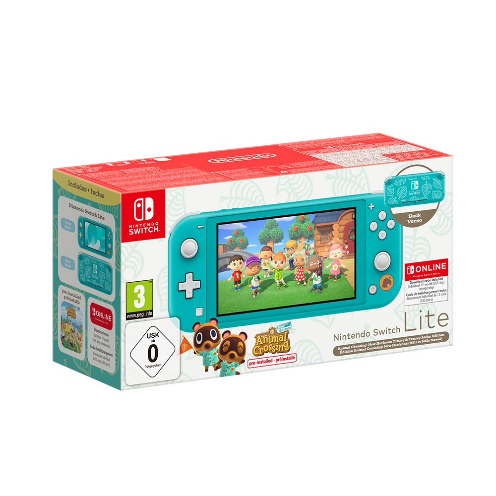 Consola, Cable de carga, Juego Animal Crossing: New Horizons (preinstalado), 12 meses de Nintendo Switch Online (código canjeable), Manuales