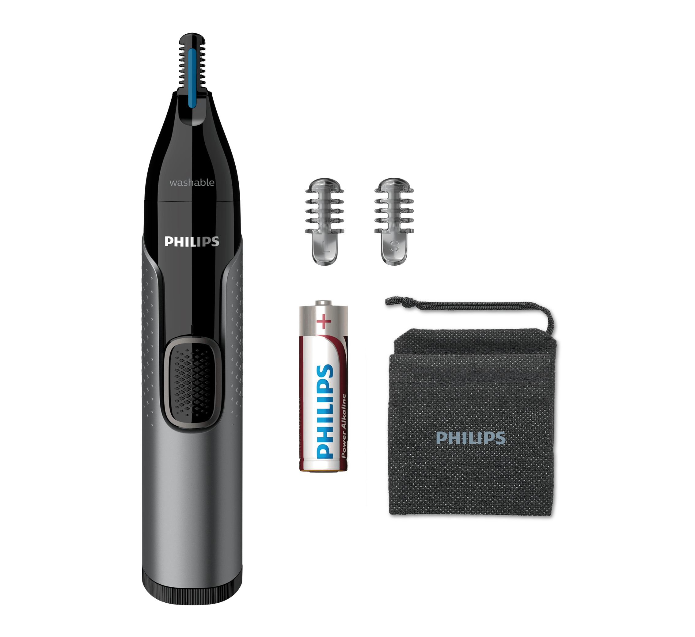 Cortapelos nariz - Philips NT3650/16, Acero inoxidable, Para orejas y cejas, 2 Peines-guía, Resistente agua, Gris, Pila AA