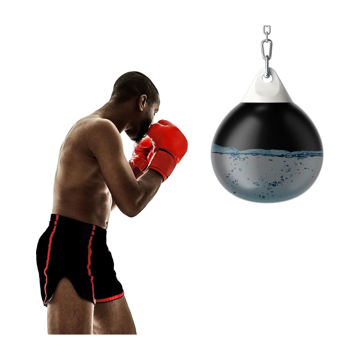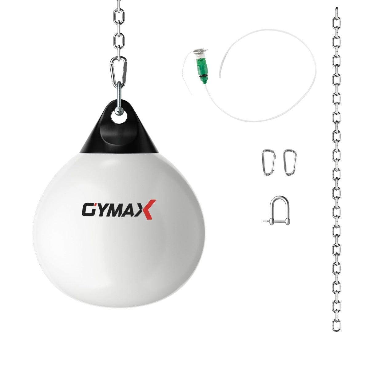 1x Saco de boxeo rellenable de agua, 1x Cadena metálica, 1x Manguera de llenado de agua, 1x Hebilla en forma de U, 2x Hebillas de seguridad