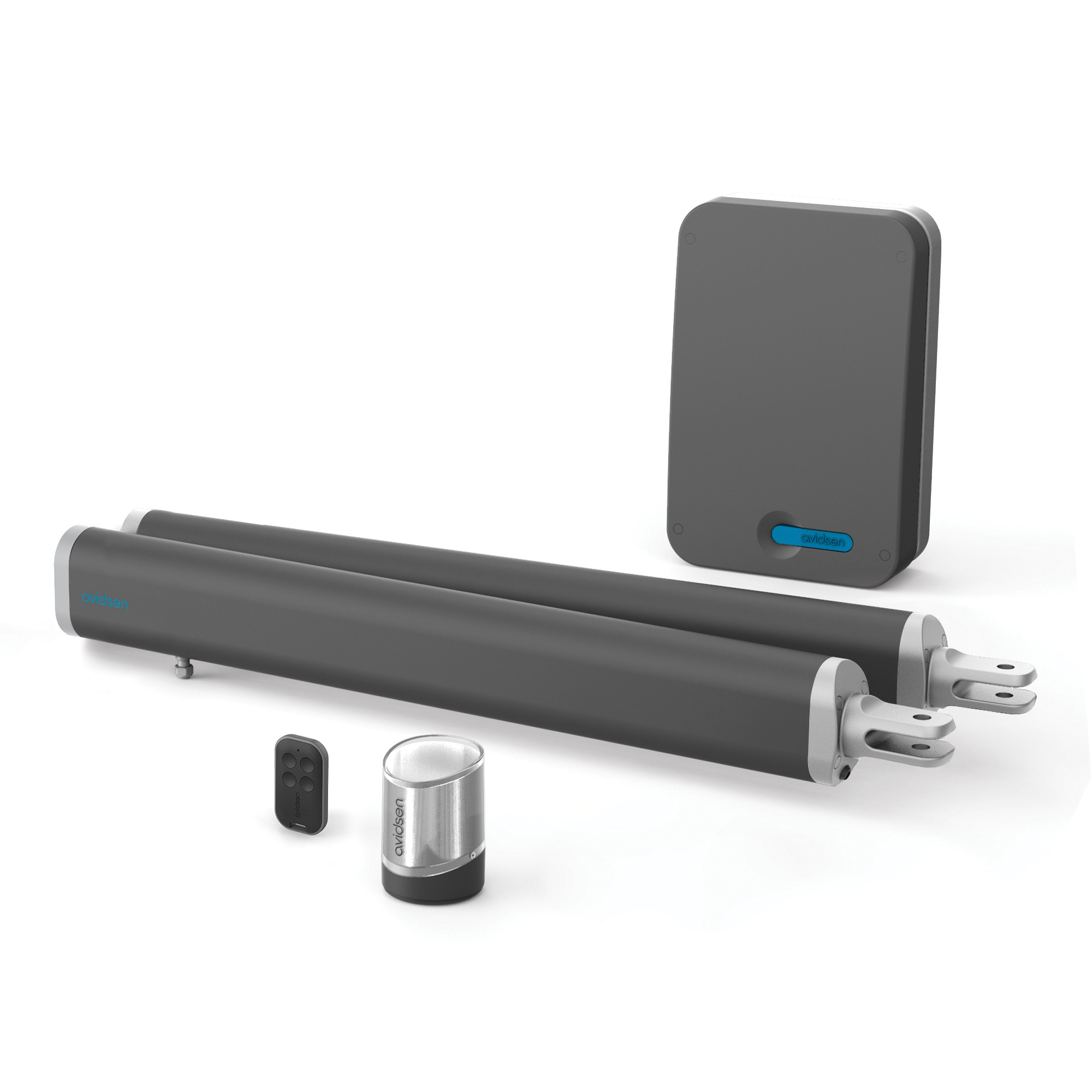 2 motores de brazos articulados 24 VDC con electrónica integrada soportes de montaje incluidos 1 mando a distancia de 4 botones 1 luz intermitente LED