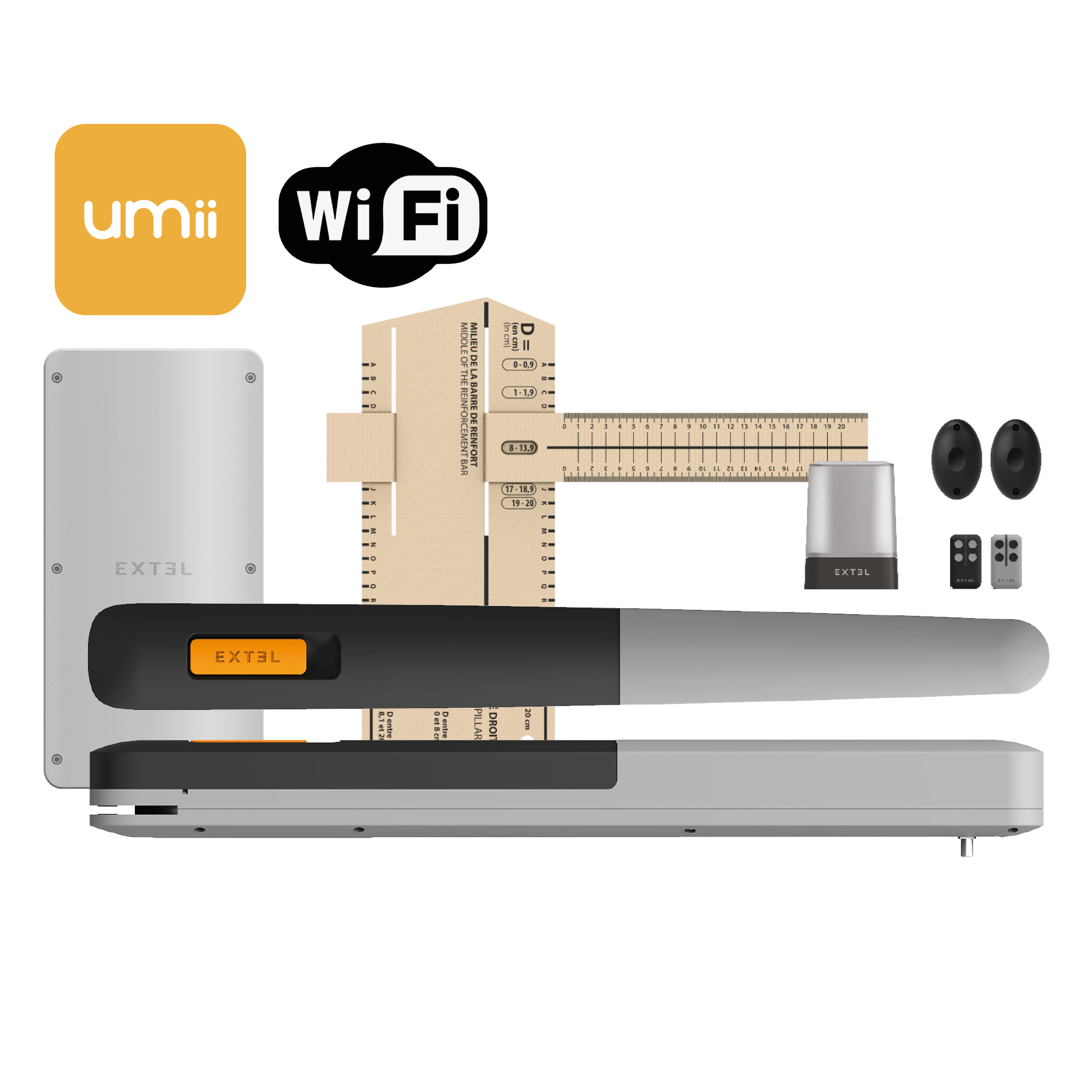 1 motor 2 mandos a distancia 1 luz intermitente 1 juego de fotocélulas 8 cremalleras de 50 cm de longitud, es decir, 4 m en total 2 llaves de desbloqueo 1 plantilla de instalación 1 guía de inicio rápido