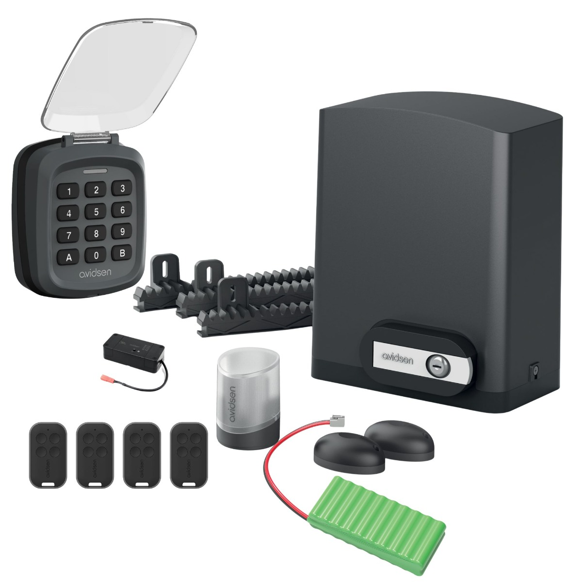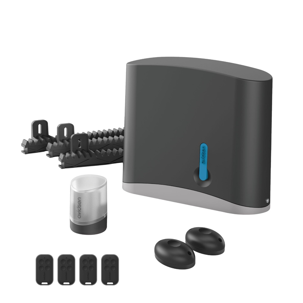[1 motor de 24 V CC con electrónica integrada 8 cremalleras de 50 cm de longitud cada una (para un total de 4 m) de nilon reforzado 2 mandos a distancia, cada uno con 4 botones 1 luz intermitente LED 1 juego de fotocélulas 1 módulo conectado Avidsen HomeG