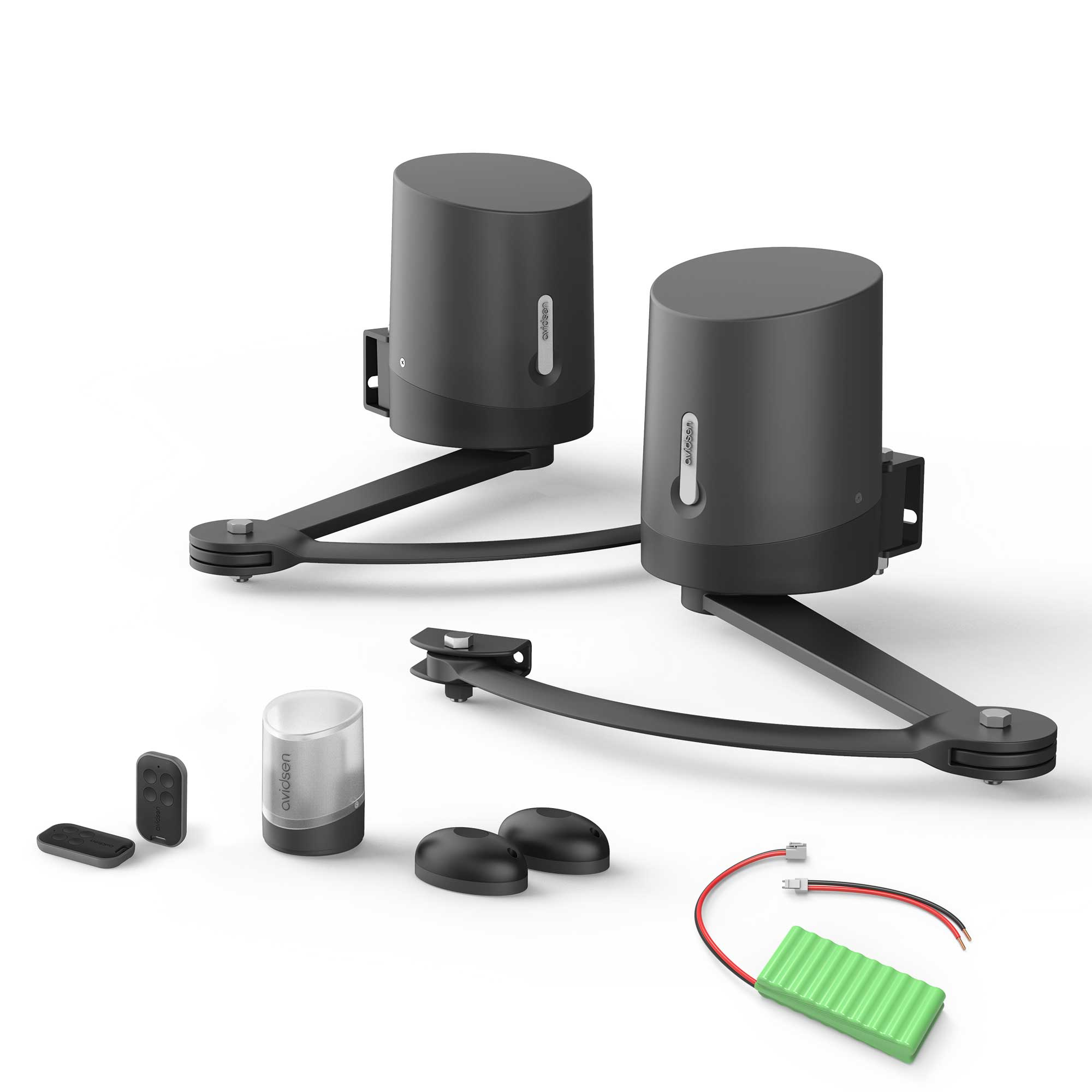 [2 motores de brazo articulado de 24 V CC con electrónica integrada 2 mandos a distancia con 4 botones cada uno 1 luz intermitente 1 juego de fotocélulas Pies de fijación y soportes 1 módulo conectado Avidsen Home Gate con sensor de posición, precableado,