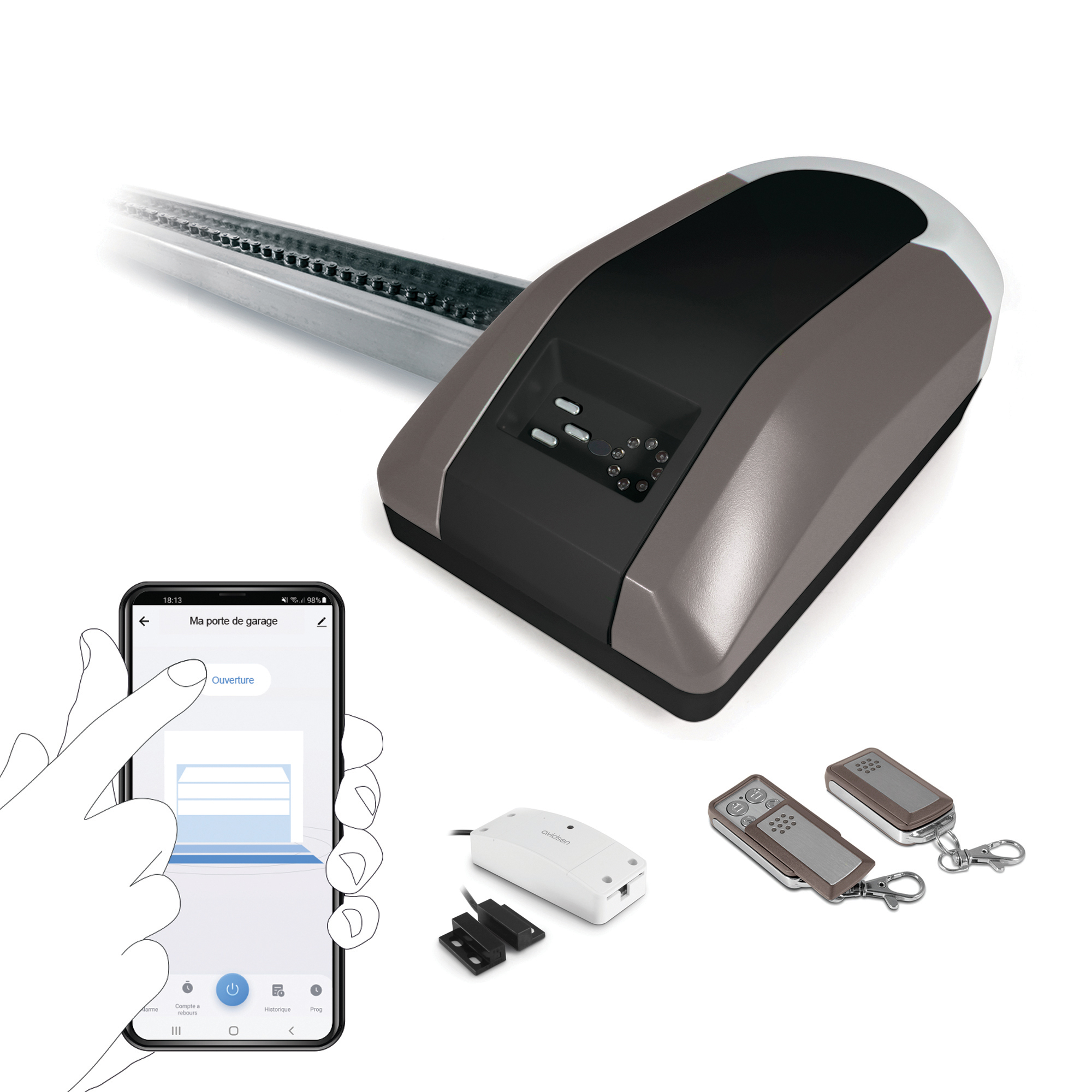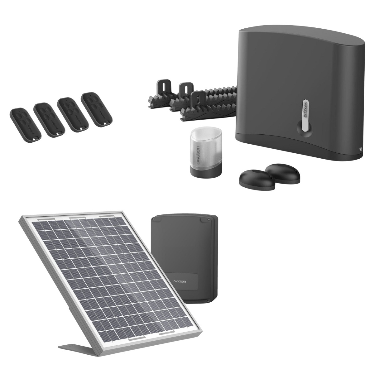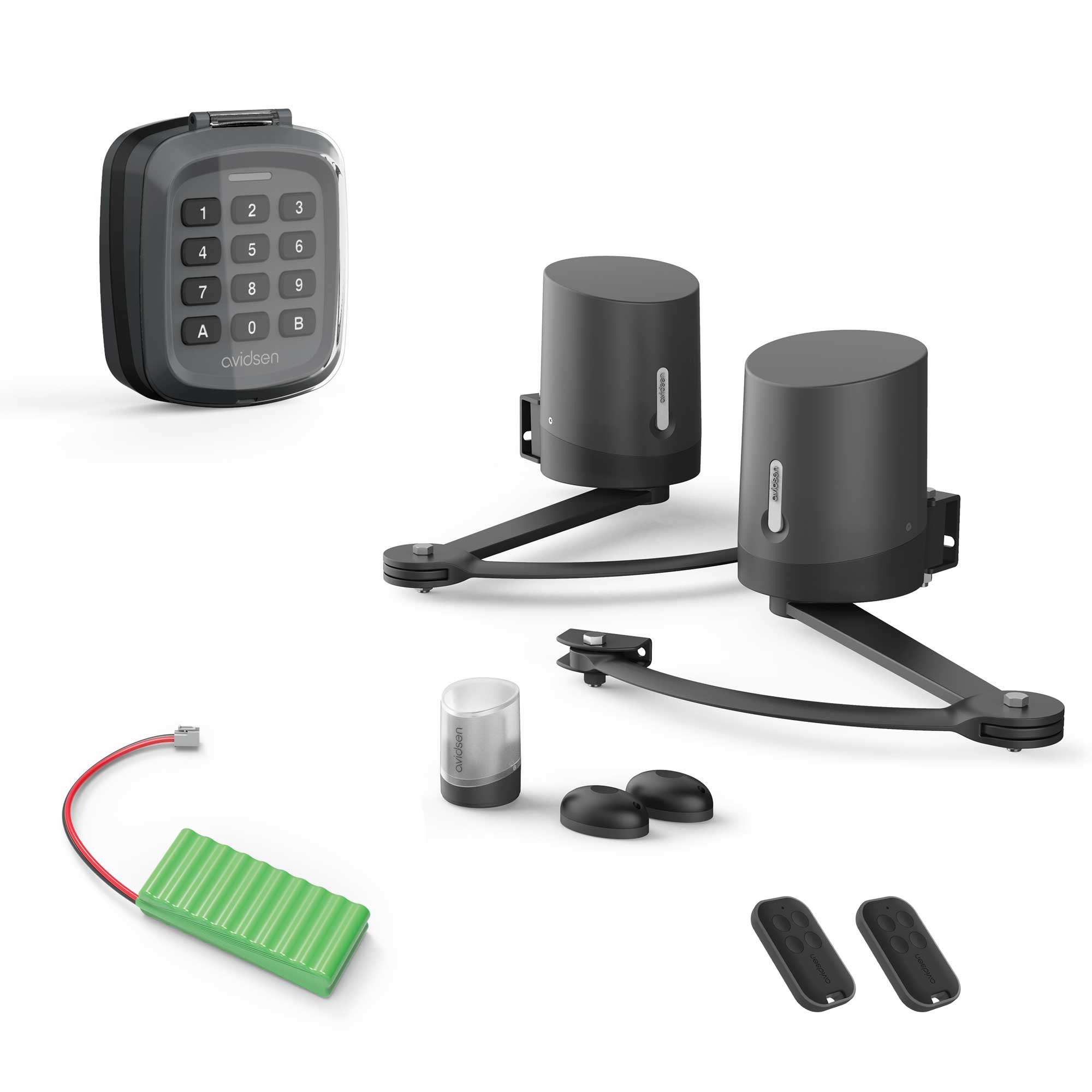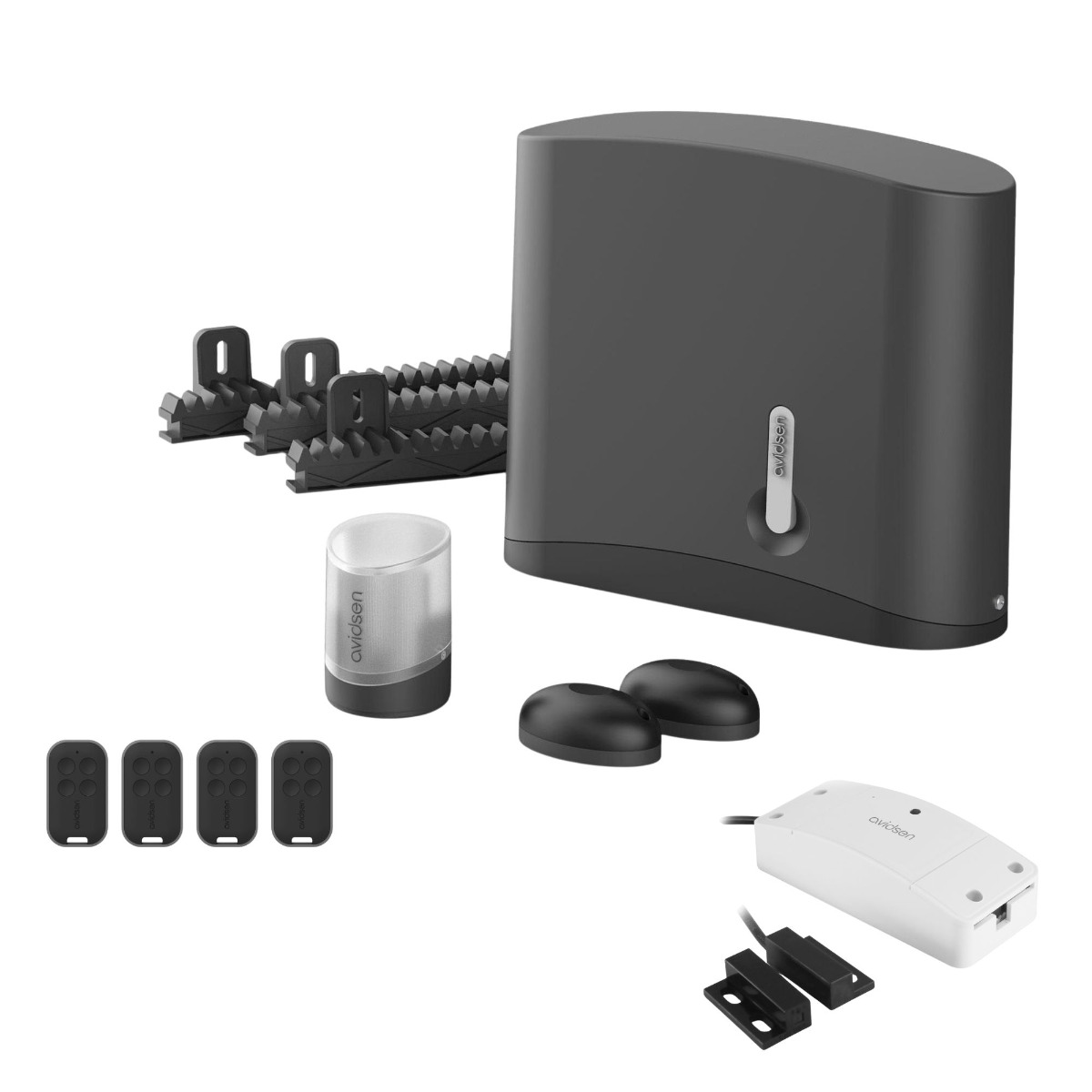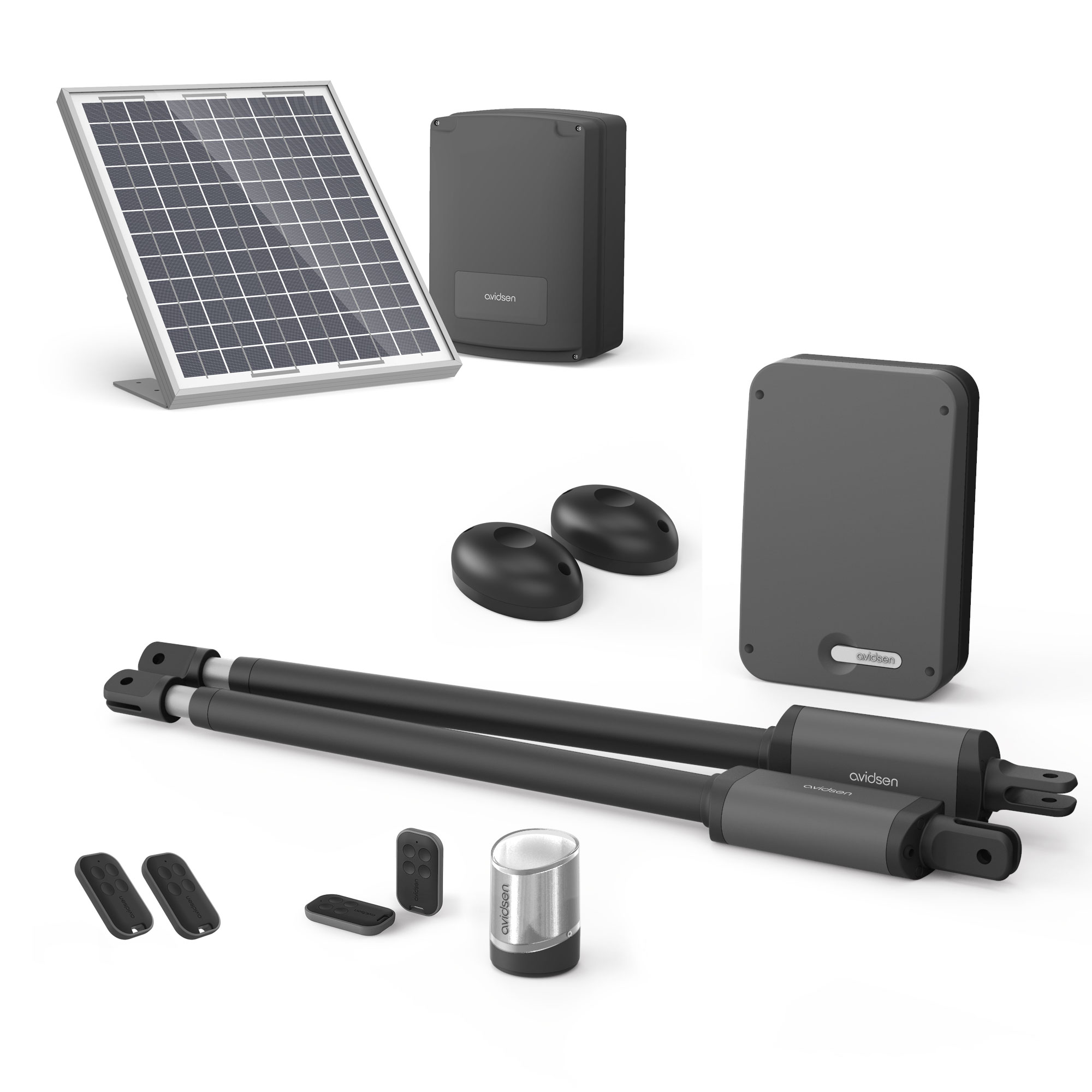 [2 motores de brazo articulado de 24 V CC con electrónica integrada 2 mandos a distancia con 4 botones cada uno 1 luz intermitente 1 juego de fotocélulas Pies de fijación y soportes 1 módulo conectado Avidsen Home Gate con sensor de posición, precableado,