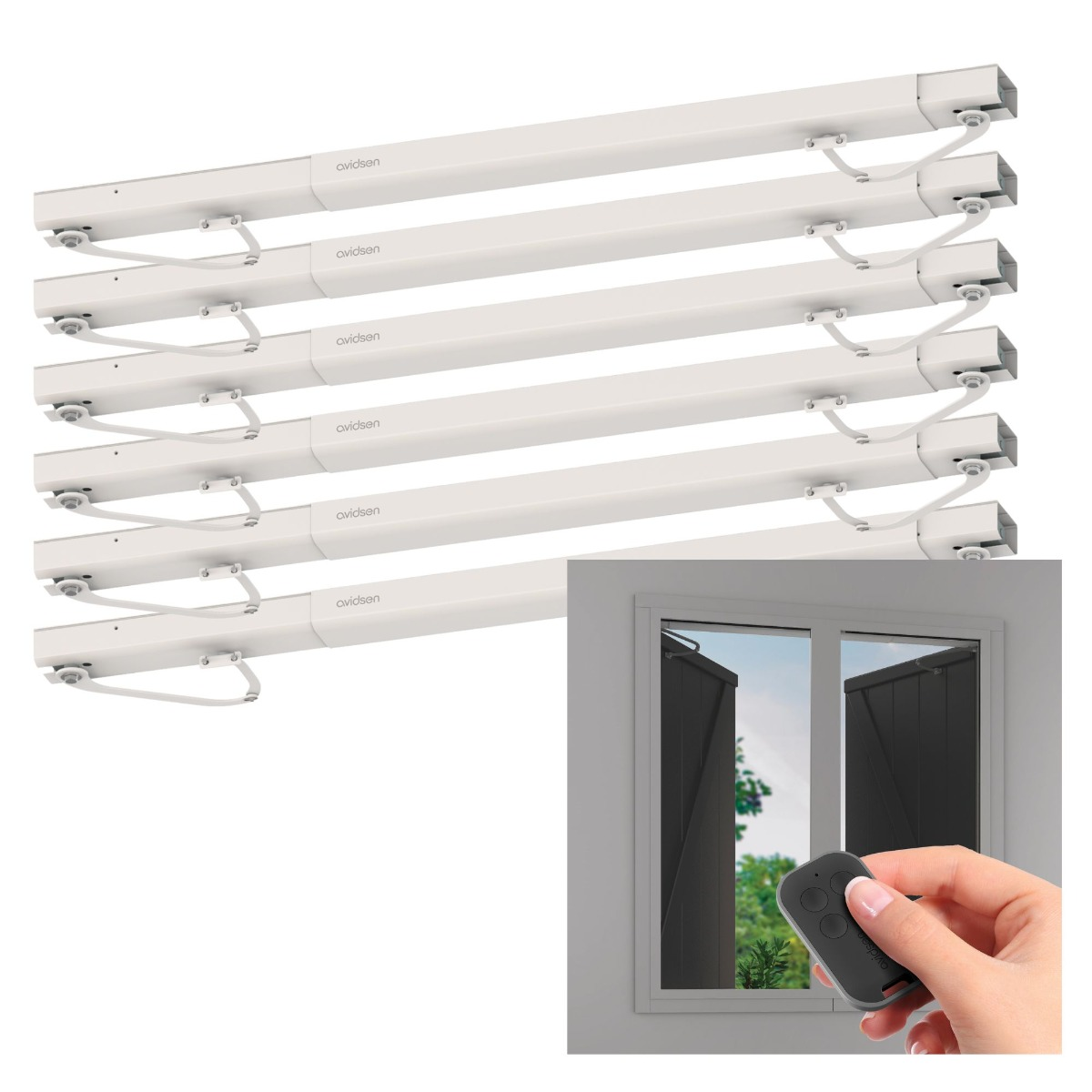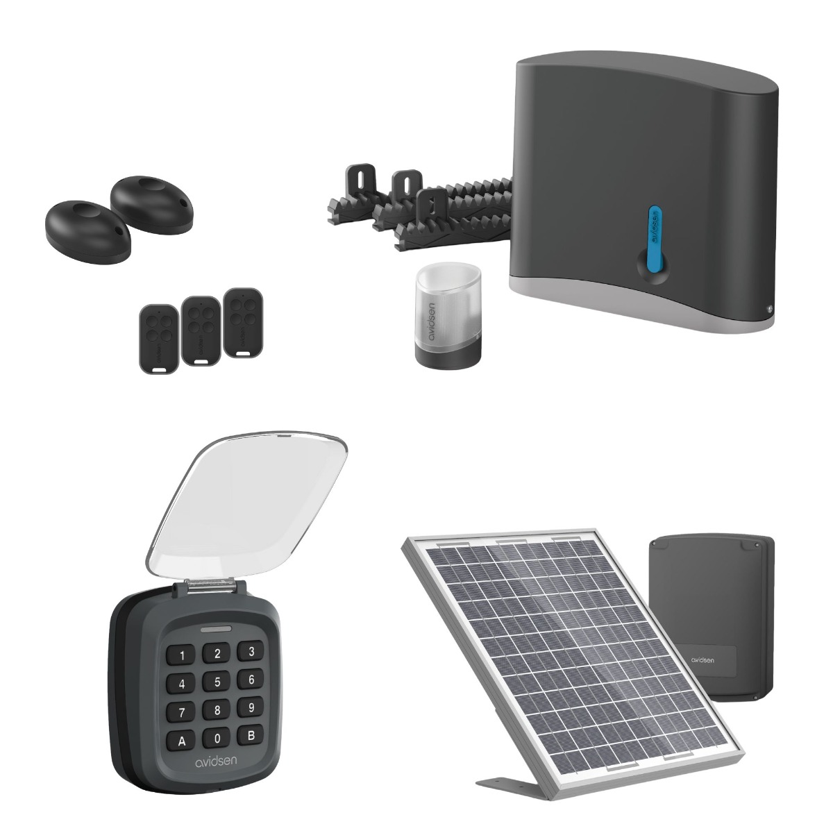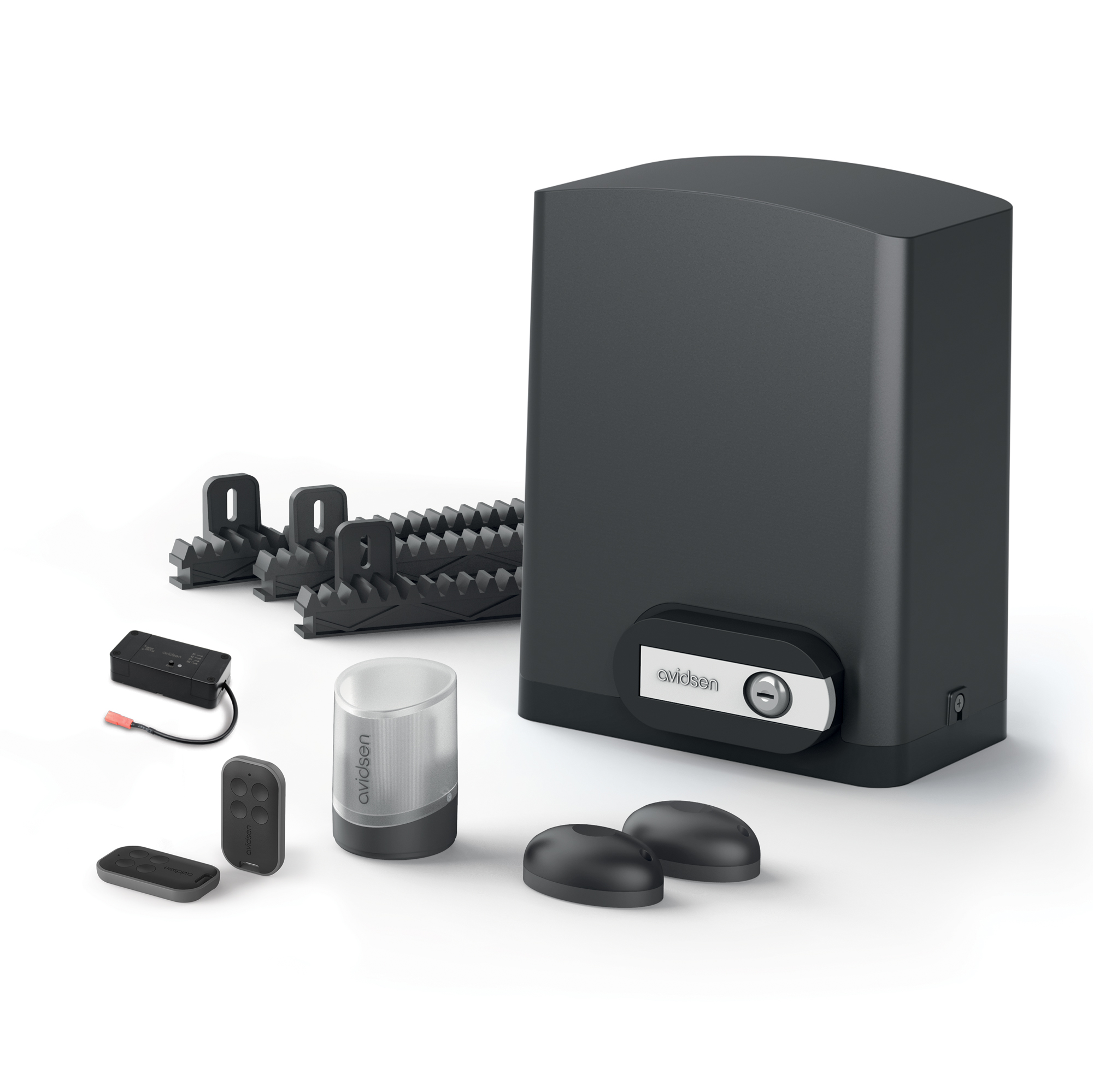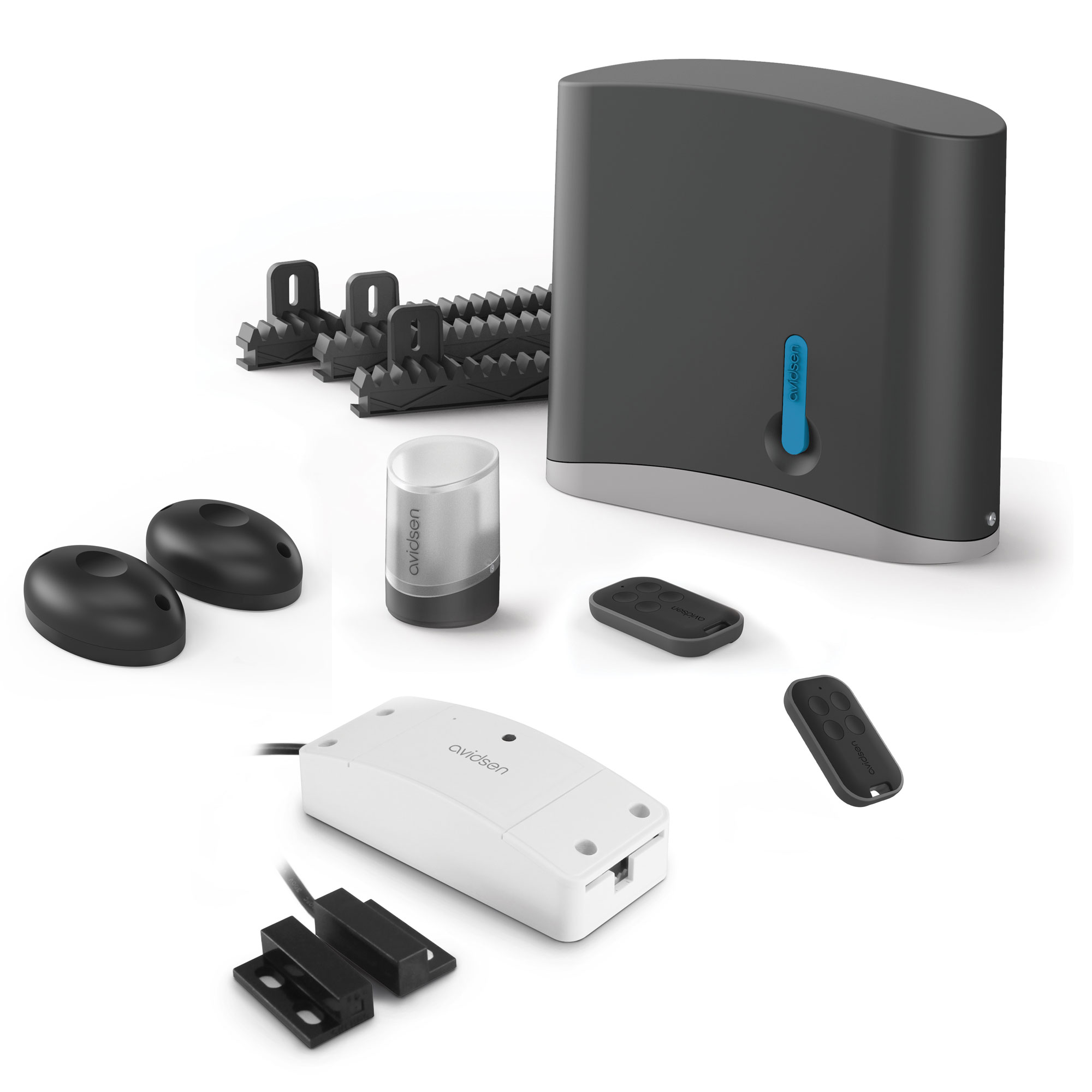 [1 motor de 24 V CC con electrónica integrada 8 cremalleras de 50 cm de longitud cada una (para un total de 4 m) de nilon reforzado 2 mandos a distancia, cada uno con 4 botones 1 luz intermitente LED 1 juego de fotocélulas 1 módulo conectado Avidsen HomeG