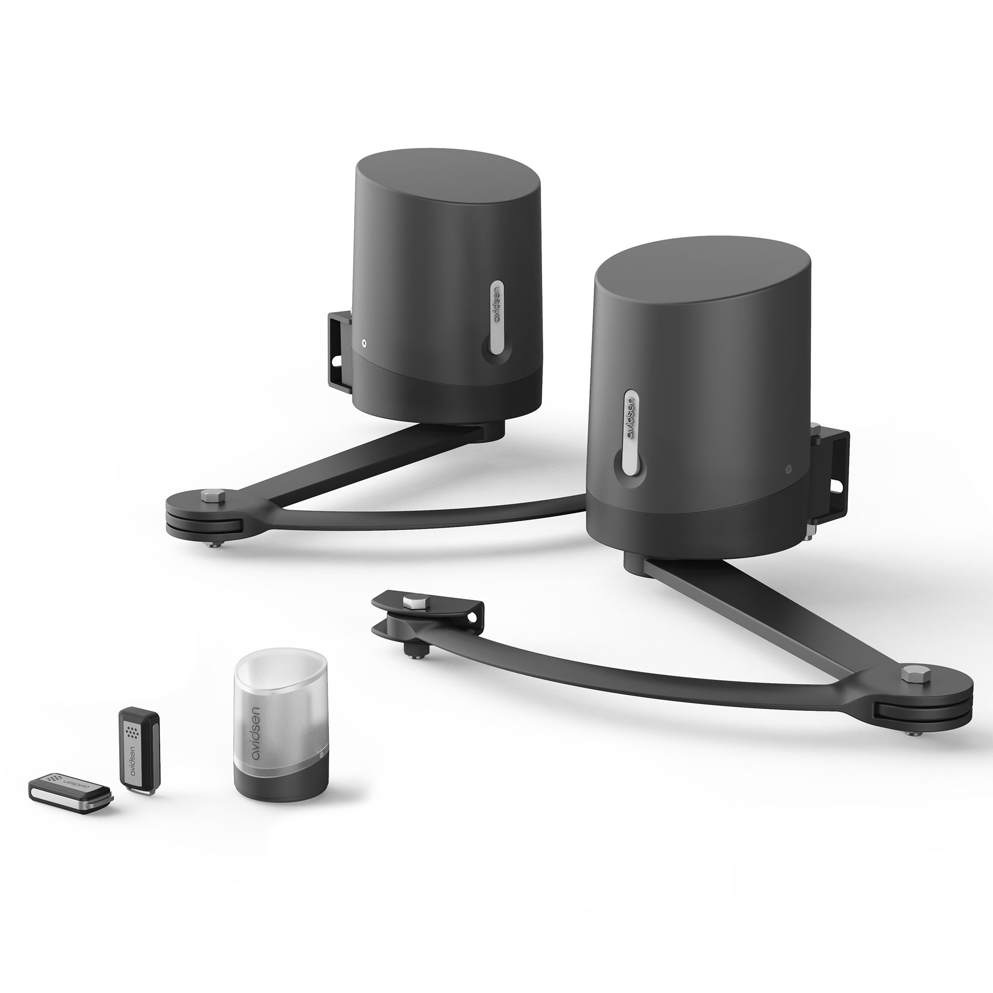 [1 motorización para cancela batiente Avidsen ORANE SE (Ref : 114203): Dos motores de brazo articulado (24VDC) con electrónica integrada y soportes de montaje incluidos; Un mando a distancia de cuatro botones; Una luz intermitente 1 kit solar Avidsen(Ref