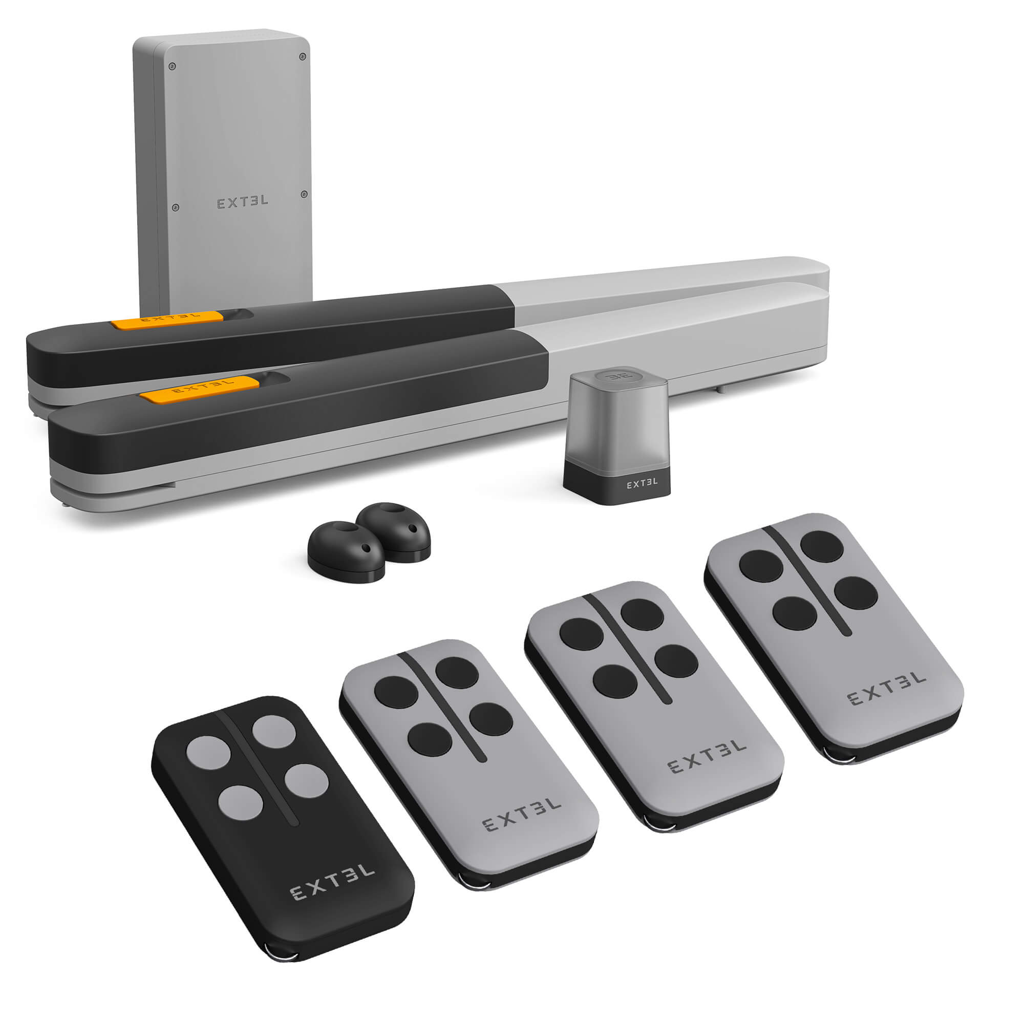 2 motores con brazos articulados de 24 VCC, con electrónica integrada. Soportes de fijación incluidos. 2 mandos a distancia de 4 botones. 1 luz intermitente.