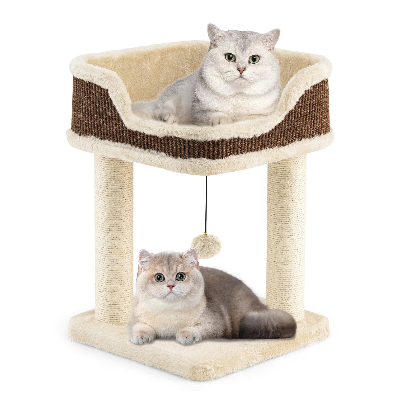 1x Árbol para gatos, 1x Condominio para gatos, 1x Plataforma superior acolchada, 1x Pompón con cascabel