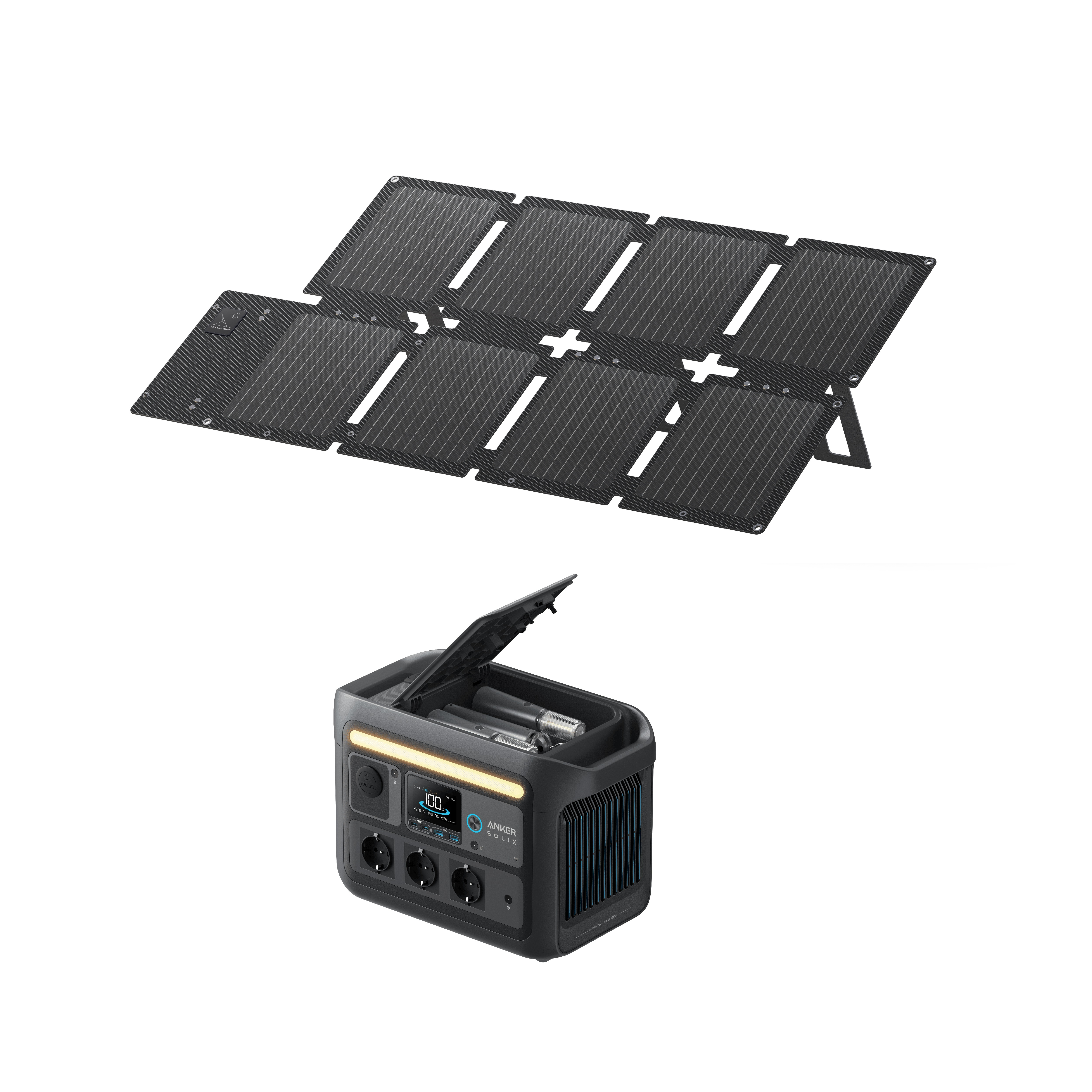 Salida de corriente alterna, CA: 3 × Schuko 230 V; Salida de corriente continua, CC: 2 × DC 12V; Salidas USB: 4 × Tipo A (5V); Salida Type-C: 1 × Tipo C (5V).