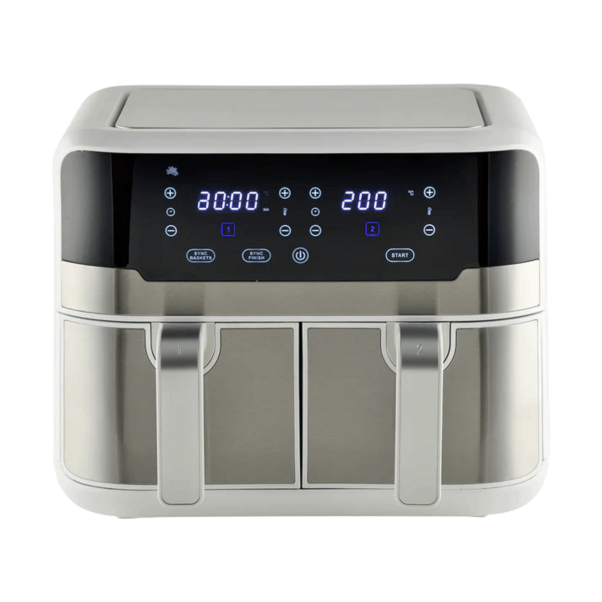 1x Freidora de aire, 2x cajones antiadherentes (4,75 L), 2x rejillas apilables de acero inox, 2x placas para gratinar, 1x Termómetro de cocción digital, 1x Guía de recetas, 1x Manual de instrucciones
