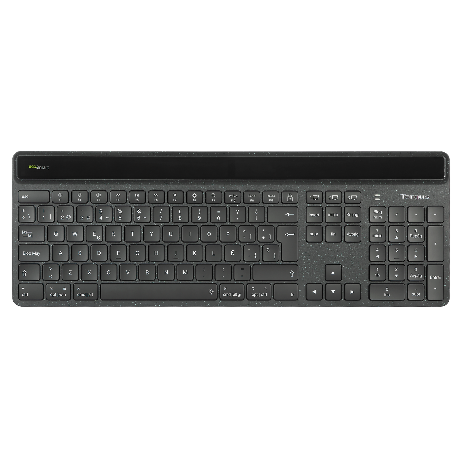 Teclado inalámbrico - Targus AKB868ES, EcoSmart Solar Keyboard, Antimicrobiano, Bluetooth, Full Size, USB-C, Negro