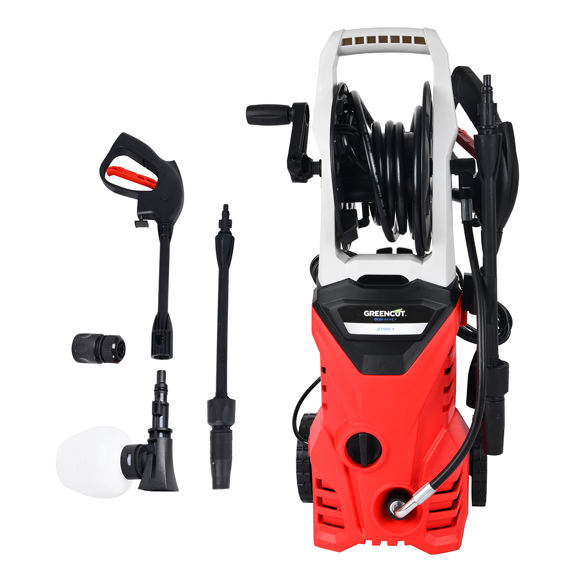 Hidrolimpiadora + pistola y lanza + manguera 5m con enrollador + kit de detergente