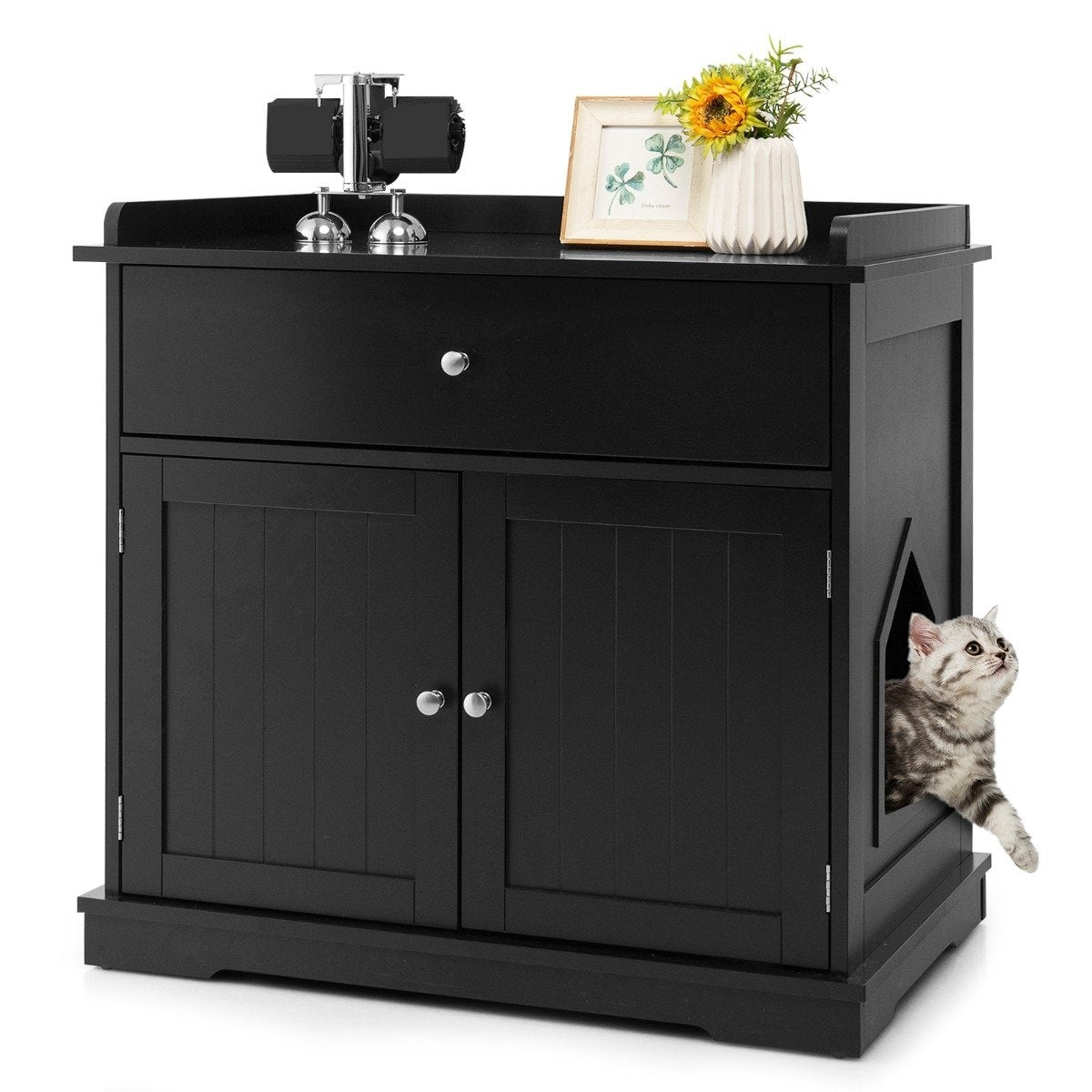 1x Mueble arenero, 1x Rascador con postes de sisal, 1x Refugio, 1x Separador extraíble, 1x Soporte de pared antivuelco, 1x Plataforma acolchada