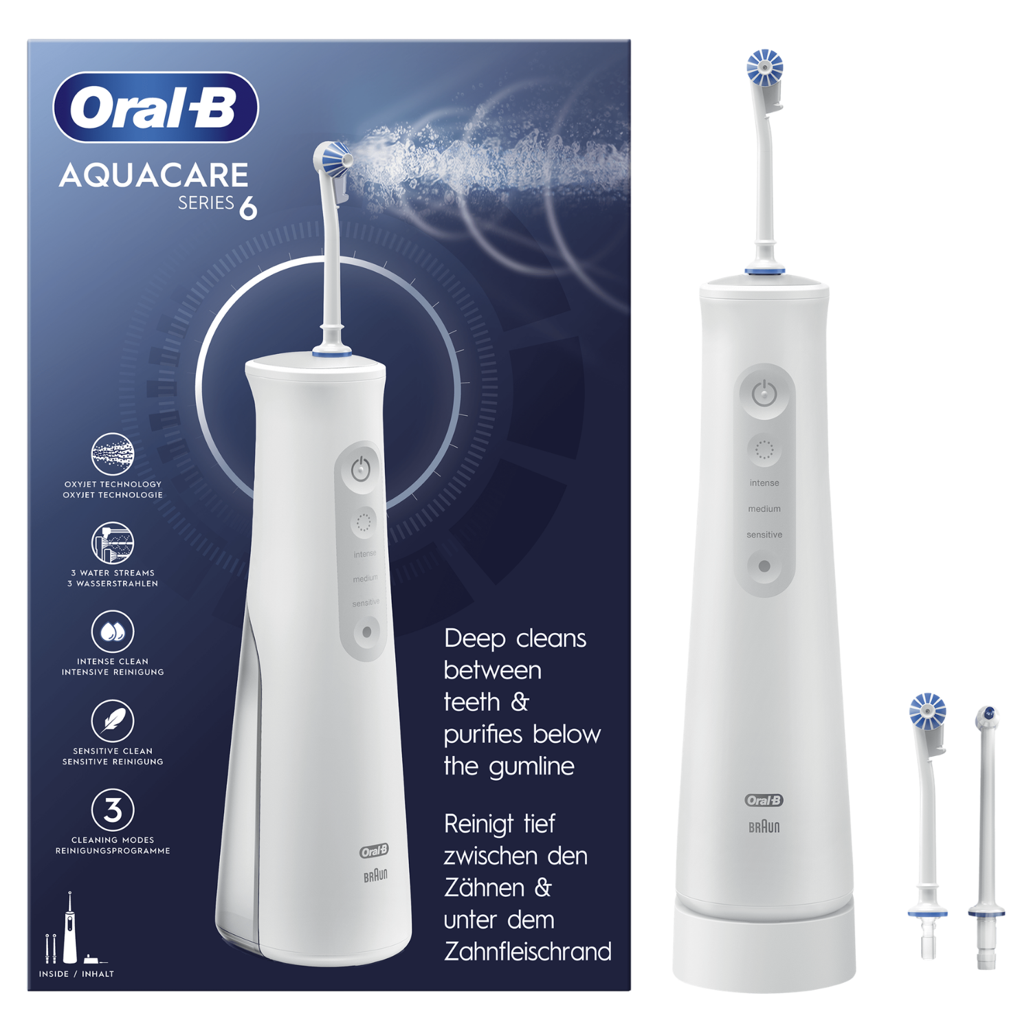 1x irrigador bucal AquaCare, 1x estación de carga, 2x boquillas Oxyjet, 1x boquilla Waterjet