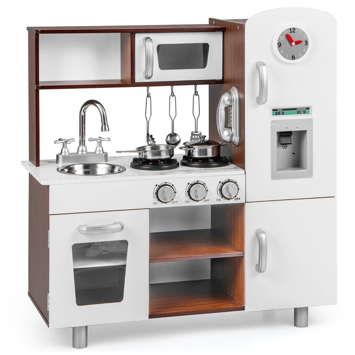 1x Cocina de juguete, 1x Microondas, 1x Teléfono inalámbrico, 1x Máquina de hielo, 1x Fregadero, 1x Horno, 1x Estufa, 1x Sartén, 1x Olla, 3x Utensilios